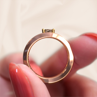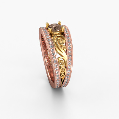Cette bague de fiançailles filigranes porte le nom Julliana. Cette bague forgée en or 14 Carat est sertie d’un diamant brun de 0.91 crt. Il y a une personne dans votre vie qui quand elle se présente devant vous, votre cœur bat plus vite, ce qui est vraiment unique pour vous. Et c’est précisément cette personne qui mérite quelque chose de spécial, quelque chose d’unique et qui a été conçu spécialement pour elle. Nous soupçonnons que cette bague de fiançailles s'intègre bien dans cette situation. Tous les détails de cette bague de fiançailles unique forgée en or rose sont composés, travaillés et polis à la main par notre orfèvre dans l'atelier ci-dessous. Notre objectif est que la conception et la composition de la bague de fiançailles renforcent et rayonnent les beaux diamants bruns. Un travail très précis, qui donne finalement à un résultat magnifique. Et c’est exactement ce que nous voulons, cela nous rend très enthousiastes. L’avantage de notre outil de configuration est que vous pouvez concevoir entièrement vos propres bijoux pour créer votre propre bijou. Cette bague de fiançailles solitaire pavé est faite à partir de la combinaison de métaux précieux : de l’or avec de l’or jaune, mais vous pouvez également choisir une autre couleur d’or. Chaque bijou est fabriquées spécialement pour vous par nos maîtres orfèvres dans notre propre atelier.Qu'y a-t-il dorénavant de plus beau qu'une bague de fiançailles vintage conçue par vous-même et fabriquée à la main par nous. Vous pouvez personnaliser chaque modèle avec les différents métaux précieux et pierres précieuses. De cette façon, vous pourrez créer une bague de fiançailles unique. Cette bague peut être mise en place de plusieurs façons. Bien sûr, vous pouvez toujours nous contacter et nous serons heureux de vous aider à composer votre bague de fiançailles vintage Julliana. Vous aimez le design, mais vous souhaitez tout de même quelque chose qui vous convienne plus, ou bien vous souhaitez une pierre précieuse dans les bijoux que vous ne pouvez pas choisir sur notre site, contactez-nous et nous vous aiderons.Notre équipe ajoute quotidiennement de nouveaux modèles à notre collection en ligne. Nos designers et orfèvres travaillent ensemble pour créer le meilleur design. Nous nous efforçons d'offrir une collection diversifiée de bijoux. Peut-être avez-vous déjà en tête un bijou en particulier ? Un bijou que vous avez trouvé quelque part. Veuillez nous contacter pour une consultation gratuite. Nous vous ferons une offre, basée sur un rapport qualité / prix juste, qui vous déconcertera.Pour vous faciliter la tâche, vous pouvez facilement nous retourner tout bijou commandé dans les 30 jours suivant la livraison.