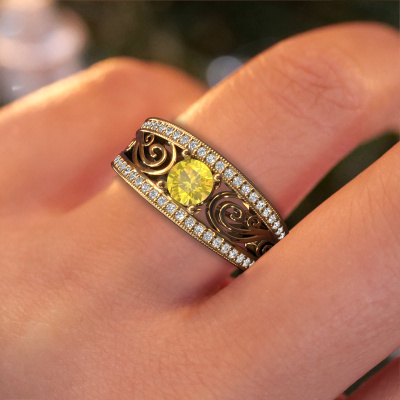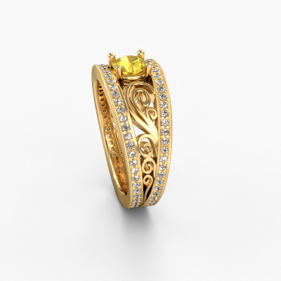 Cette bague de fiançailles filigranes porte le nom Julliana. Cette bague forgée en or 14 Carat est sertie d’un saphir jaune de 5 mm. Il y a une personne dans votre vie qui quand elle se présente devant vous, votre cœur bat plus vite, ce qui est vraiment unique pour vous. Et c’est précisément cette personne qui mérite quelque chose de spécial, quelque chose d’unique et qui a été conçu spécialement pour elle. Nous soupçonnons que cette bague de fiançailles s'intègre bien dans cette situation. Tous les détails de cette bague de fiançailles unique forgée en or jaune sont composés, travaillés et polis à la main par notre orfèvre dans l'atelier ci-dessous. Notre objectif est que la conception et la composition de la bague de fiançailles renforcent et rayonnent les beaux saphirs jaunes. Un travail très précis, qui donne finalement à un résultat magnifique. Et c’est exactement ce que nous voulons, cela nous rend très enthousiastes. L’avantage de notre outil de configuration est que vous pouvez concevoir entièrement vos propres bijoux pour créer votre propre bijou. Cette bague de fiançailles solitaire pavé est faite à partir de la combinaison de métaux précieux : de l’or avec de l’or jaune, mais vous pouvez également choisir une autre couleur d’or. Chaque bijou est fabriquées spécialement pour vous par nos maîtres orfèvres dans notre propre atelier.Qu'y a-t-il dorénavant de plus beau qu'une bague de fiançailles vintage conçue par vous-même et fabriquée à la main par nous. Vous pouvez personnaliser chaque modèle avec les différents métaux précieux et pierres précieuses. De cette façon, vous pourrez créer une bague de fiançailles unique. Cette bague peut être mise en place de plusieurs façons. Bien sûr, vous pouvez toujours nous contacter et nous serons heureux de vous aider à composer votre bague de fiançailles vintage Julliana. Vous aimez le design, mais vous souhaitez tout de même quelque chose qui vous convienne plus, ou bien vous souhaitez une pierre précieuse dans les bijoux que vous ne pouvez pas choisir sur notre site, contactez-nous et nous vous aiderons.Notre équipe ajoute quotidiennement de nouveaux modèles à notre collection en ligne. Nos designers et orfèvres travaillent ensemble pour créer le meilleur design. Nous nous efforçons d'offrir une collection diversifiée de bijoux. Peut-être avez-vous déjà en tête un bijou en particulier ? Un bijou que vous avez trouvé quelque part. Veuillez nous contacter pour une consultation gratuite. Nous vous ferons une offre, basée sur un rapport qualité / prix juste, qui vous déconcertera.Pour vous faciliter la tâche, vous pouvez facilement nous retourner tout bijou commandé dans les 30 jours suivant la livraison.