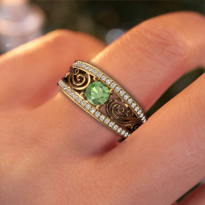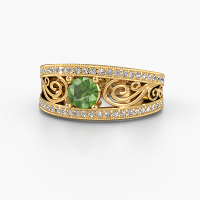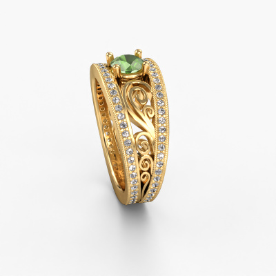 Cette bague de fiançailles filigranes porte le nom Julliana. Cette bague forgée en or 14 Carat est sertie d’un vert tourmaline de 5 mm. Il y a une personne dans votre vie qui quand elle se présente devant vous, votre cœur bat plus vite, ce qui est vraiment unique pour vous. Et c’est précisément cette personne qui mérite quelque chose de spécial, quelque chose d’unique et qui a été conçu spécialement pour elle. Nous soupçonnons que cette bague de fiançailles s'intègre bien dans cette situation. Tous les détails de cette bague de fiançailles unique forgée en or jaune sont composés, travaillés et polis à la main par notre orfèvre dans l'atelier ci-dessous. Notre objectif est que la conception et la composition de la bague de fiançailles renforcent et rayonnent les beaux vert tourmaline. Un travail très précis, qui donne finalement à un résultat magnifique. Et c’est exactement ce que nous voulons, cela nous rend très enthousiastes. L’avantage de notre outil de configuration est que vous pouvez concevoir entièrement vos propres bijoux pour créer votre propre bijou. Cette bague de fiançailles solitaire pavé est faite à partir de la combinaison de métaux précieux : de l’or avec de l’or jaune, mais vous pouvez également choisir une autre couleur d’or. Chaque bijou est fabriquées spécialement pour vous par nos maîtres orfèvres dans notre propre atelier.Qu'y a-t-il dorénavant de plus beau qu'une bague de fiançailles vintage conçue par vous-même et fabriquée à la main par nous. Vous pouvez personnaliser chaque modèle avec les différents métaux précieux et pierres précieuses. De cette façon, vous pourrez créer une bague de fiançailles unique. Cette bague peut être mise en place de plusieurs façons. Bien sûr, vous pouvez toujours nous contacter et nous serons heureux de vous aider à composer votre bague de fiançailles vintage Julliana. Vous aimez le design, mais vous souhaitez tout de même quelque chose qui vous convienne plus, ou bien vous souhaitez une pierre précieuse dans les bijoux que vous ne pouvez pas choisir sur notre site, contactez-nous et nous vous aiderons.Notre équipe ajoute quotidiennement de nouveaux modèles à notre collection en ligne. Nos designers et orfèvres travaillent ensemble pour créer le meilleur design. Nous nous efforçons d'offrir une collection diversifiée de bijoux. Peut-être avez-vous déjà en tête un bijou en particulier ? Un bijou que vous avez trouvé quelque part. Veuillez nous contacter pour une consultation gratuite. Nous vous ferons une offre, basée sur un rapport qualité / prix juste, qui vous déconcertera.Pour vous faciliter la tâche, vous pouvez facilement nous retourner tout bijou commandé dans les 30 jours suivant la livraison.