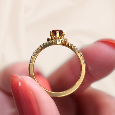 Cette bague de fiançailles porte le nom Elli. Cette bague de fiançailles élégants est forgée en or 14 Carat et est sertie d’un grenat de 5 mm. Cette bague de fiançailles solitaire pavé et forgée en or jaune unique est un pur travail d’art ! Tous les petits détails ont été fabriqués avec beaucoup de patience et de passion par notre orfèvre. Ce métier nécessite un œil expert et une main habile pour assembler cette bague de fiançailles avec la plus grande précision. Et ce travail est précisément ce qui enthousiasme nos orfèvres ! Les plus beaux grenats sont sertis de manière large, de telle sorte qu'ils puissent rendre un effet encore meilleurs. Cela donne donc une allure supplémentaire à la bague de fiançailles. La bague de fiançailles est unique en raison de sa pierre précieuse naturelle, que nous avons spécialement sélectionnée pour cette bague. De plus, vous pouvez choisir vous-même la composition du métal précieux de votre bague. Vous aurez donc créé une bague de fiançailles unique pour la femmes la plus unique de votre vie ! Ce bijou est spécialement conçues pour vous, avec une attention particulière portée aux détails et au design.Saviez-vous que nous offrons la garantie du meilleur prix pour votre bague de fiançailles? Cela est possible car tous nos bijoux sont fabriqués à la main dans notre propre atelier. Nous n'avons pas de frais de stocks qui sont coûteux, et nous fabriquons votre bague uniquement une fois que vous l'avez commandée. Grâce au fait que nous ayons toute la production du bijou en main, nous pouvons vous informer sur toutes les caractéristiques de cette bague de fiançailles. C’est précisément parce que l’achat d’une bague en ligne est une expérience excitante que nous comprenons qu’il est plus confortable pour vous de connaître toutes les caractéristiques de votre bague.Notre équipe de designers talentueux et passionnés ajoute chaque jour de nouveaux modèles bague de fiançailles à notre collection en ligne. Notre objectif est de pouvoir vous offrir une grande variété de bijoux. N'hésitez pas à demander un devis si vous avez des souhaits spécifiques pour votre bague de fiançailles. Nous garantissons de vous faire une offre que vous ne pourrez pas refuser.Pour vous faciliter la tâche, vous pouvez facilement nous retourner tout bijou commandé dans les 30 jours suivant la livraison.
