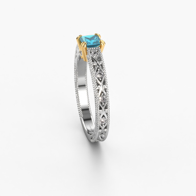 Nous avons donné le nom Ardella à cette bague de fiançailles. Cette bague forgée en or 14 Carat est sertie d’un topaze bleue de 4 mm. Cette bague est une large bague vintage forgée en or blanc unique qui fera certainement briller l’amour de votre vie ! Et c'est exactement ce que nous avons comme objectif. Un beau topaze bleue est serti dans cette bague de fiançailles vintage. Vous pouvez, bien entendu, utiliser chaque pierre précieuses que nous proposons sur notre site La pierre précieuse sera sélectionnée avec soin, car nous pensons que seule la plus belle des pierres précieuses peut briller sur votre bague de fiançailles filigranes, qu’en dites-vous ? Notre orfèvre fabrique votre bague de fiançailles dans notre propre atelier et place le topaze bleue dans l'anneau de la bague avec une précision extrême. Donc, elle est travaillée et polie jusqu'à ce que le résultat désiré soit visible : la bague de fiançailles parfaite pour l'amour de votre vie ! Ce bijou est fabriquée spécialement pour vous par nos maîtres orfèvres dans notre propre atelier.Saviez-vous que nous offrons la garantie du meilleur prix pour votre bague de fiançailles? Cela est possible car tous nos bijoux sont fabriqués à la main dans notre propre atelier. Nous n'avons pas de frais de stocks qui sont coûteux, et nous fabriquons votre bague uniquement une fois que vous l'avez commandée. Grâce au fait que nous ayons toute la production du bijou en main, nous pouvons vous informer sur toutes les caractéristiques de cette bague de fiançailles. C’est précisément parce que l’achat d’une bague en ligne est une expérience excitante que nous comprenons qu’il est plus confortable pour vous de connaître toutes les caractéristiques de votre bague.Notre équipe ajoute quotidiennement de nouveaux modèles à notre collection en ligne. Nos designers et orfèvres travaillent ensemble pour créer le meilleur design. Nous nous efforçons d'offrir une collection diversifiée de bijoux. Peut-être avez-vous déjà en tête un bijou en particulier ? Un bijou que vous avez trouvé quelque part. Veuillez nous contacter pour une consultation gratuite. Nous vous ferons une offre, basée sur un rapport qualité / prix juste, qui vous déconcertera.Pour vous faciliter la tâche, vous pouvez facilement nous retourner tout bijou commandé dans les 30 jours suivant la livraison.
