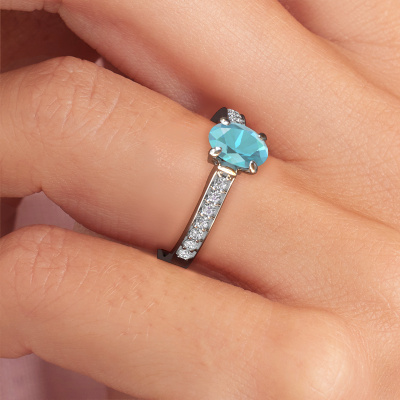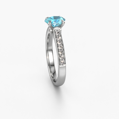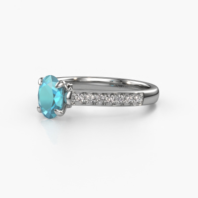 Nous avons donné le nom Valorie ovl 2 à la bague de fiançailles mentionnée ci-dessous. Ce type de bague de fiançailles est appelé une bague de fiançailles solitaire pavé car elle ne comporte qu’une seule pierre centrale et les tiges de la bague de fiançailles ont également une finition pleine. Cette bague de fiançailles est forgée en or 14 Carat et comporte un topaze bleue ovale de 7x5 mm. Des diamants synthétiques sont sertis dans les épaules latérales de l’anneau. Chaque bijou est faite avec passion et amour par l'un de nos maîtres orfèvres.. Cette bague de fiançailles solitaire pavé forgée en or blanc à la mode a un beau topaze bleue ovale en guise de pierre centrale, avec plus de diamants synthétiques dans l’anneau pour accentuer encore plus l’effet de la pierre centrale. Le sertissage à griffes autour du topaze bleue étant ouvert, le topaze bleue capte la lumière de tous les côtés et brille de manière optimale. Ci-dessus, vous pouvez voir comment notre orfèvre a travaillé la bague de fiançailles dans les moindres détails. de telle sorte que le topaze bleue élevé puisse véritablement attirer tous les regards. Quelle belle bague de fiançailles à offre lors de votre demande en mariage à l'amour de votre vie, à votre centre rayonnant ! Vous avez peut-être remarqué que nos prix sont en moyenne inférieurs de 30% à ceux d'un autre bijoutier. Et ce alors que la qualité de nos bijoux est même plus élevée dans la plupart des cas ! En effet, nos orfèvres fabriquent votre bague de fiançailles directement dans notre propre atelier. Cela signifie que nous n'avons pas à inclure des frais de stocks coûteux et que nous pouvons travailler n'importe quel détail directement sur votre bague de fiançailles.Notre équipe ajoute quotidiennement de nouveaux modèles à notre collection en ligne. Nos designers et orfèvres travaillent ensemble pour créer le meilleur design. Nous nous efforçons d'offrir une collection diversifiée de bijoux. Peut-être avez-vous déjà en tête un bijou en particulier ? Un bijou que vous avez trouvé quelque part. Veuillez nous contacter pour une consultation gratuite. Nous vous ferons une offre, basée sur un rapport qualité / prix juste, qui vous déconcertera.Pour vous faciliter la tâche, vous pouvez facilement nous retourner tout bijou commandé dans les 30 jours suivant la livraison.