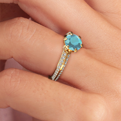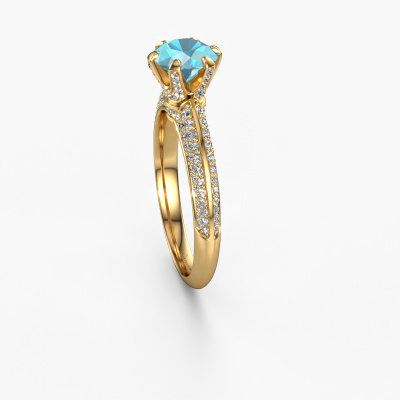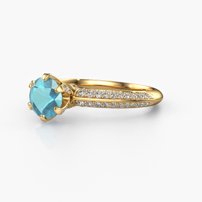 La bague de fiançailles mentionnée ci-dessus a été nommée Abby. Ce type de bague de fiançailles est appelé une bague de fiançailles solitaire pavé car elle ne comporte qu’une seule pierre centrale et les tiges de la bague de fiançailles sont également pleins. La bague de fiançailles est faite dans une combinaison d'or 14 Carat et d’or jaune et a un topaze bleue ronds d’une de 6.5 mm, et des diamants sont sertis sur les épaules de l’anneau. Chaque bijou est fabriquées spécialement pour vous par nos maîtres orfèvres dans notre propre atelier. Cette bague de fiançailles solitaire pavé forgée en or jaune exclusives a un beau topaze bleue ronds comme pierre centrale, avec plus de topaze bleue sertis dans la bague pour accentuer encore plus la présence de la pierre centrale. Le sertissage à griffes autour du topaze bleue étant ouvert, le topaze bleue capte la lumière de tous les côtés et brille de manière optimale. Ci-dessus, vous pouvez voir comment notre orfèvre travaille la bague de fiançailles avec une extrême précision dans les moindres détails, de telle sorte que le topaze bleue élevé puisse attirer tous les regards. Quelle belle bague de fiançailles à offrir lors de votre demande en mariage à l'amour de votre vie, à votre centre rayonnant ! Vous avez peut-être remarqué que nos prix sont en moyenne inférieurs de 30% à ceux d'un autre bijoutier. Et ce alors que la qualité de nos bijoux est même plus élevée dans la plupart des cas ! En effet, nos orfèvres fabriquent votre bague de fiançailles directement dans notre propre atelier. Cela signifie que nous n'avons pas à inclure des frais de stocks coûteux et que nous pouvons travailler n'importe quel détail directement sur votre bague de fiançailles.Notre équipe ajoute quotidiennement de nouveaux modèles à notre collection en ligne. Nos designers et orfèvres travaillent ensemble pour créer le meilleur design. Nous nous efforçons d'offrir une collection diversifiée de bijoux. Peut-être avez-vous déjà en tête un bijou en particulier ? Un bijou que vous avez trouvé quelque part. Veuillez nous contacter pour une consultation gratuite. Nous vous ferons une offre, basée sur un rapport qualité / prix juste, qui vous déconcertera.Pour vous faciliter la tâche, vous pouvez facilement nous retourner tout bijou commandé dans les 30 jours suivant la livraison.
