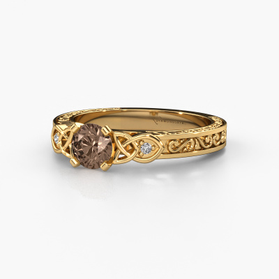 Nous avons donné le nom Gillian à cette bague de fiançailles. Cette bague de fiançailles ajour forgée en or 14 Carat est sertie d’un diamant brun de 0.52 crt. Votre petite amie a-t-elle un faible pour le vintage ? Vous pouvez donc être sûr que cette bague de fiançailles forgée en or jaune conviendra à son style ! Un nouveau modèle basé sur des motifs vintage. Un peu de rêve, un beau design, surtout si vous l’ajustez encore plus à votre goût. De magnifiques diamants bruns ont été sertis sur cette bague de fiançailles trois pierres vintage. Comme vous pouvez le constater, vous pouvez choisir vous-même une pierre précieuse qui convient à votre petite amie. Chaque pierre précieuse est soigneusement sélectionnée par nos commerçants du monde entier. Notre orfèvre ne veut travailler que les plus belles pierres précieuses sur votre bijou. Après tout, c'est la couronne de son travail ! Chaque bijou est faite spécialement pour vous, avec une attention particulière portée aux détails et au design.Saviez-vous que nous offrons la garantie du meilleur prix pour votre bague de fiançailles? Cela est possible car tous nos bijoux sont fabriqués à la main dans notre propre atelier. Nous n'avons pas de frais de stocks qui sont coûteux, et nous fabriquons votre bague uniquement une fois que vous l'avez commandée. Grâce au fait que nous ayons toute la production du bijou en main, nous pouvons vous informer sur toutes les caractéristiques de cette bague de fiançailles. C’est précisément parce que l’achat d’une bague en ligne est une expérience excitante que nous comprenons qu’il est plus confortable pour vous de connaître toutes les caractéristiques de votre bague.Notre équipe ajoute quotidiennement de nouveaux modèles à notre collection en ligne. Nos designers et orfèvres travaillent ensemble pour créer le meilleur design. Nous nous efforçons d'offrir une collection diversifiée de bijoux. Peut-être avez-vous déjà en tête un bijou en particulier ? Un bijou que vous avez trouvé quelque part. Veuillez nous contacter pour une consultation gratuite. Nous vous ferons une offre, basée sur un rapport qualité / prix juste, qui vous déconcertera.Pour vous faciliter la tâche, vous pouvez facilement nous retourner tout bijou commandé dans les 30 jours suivant la livraison.