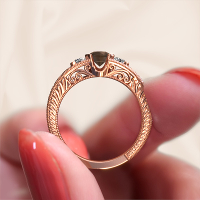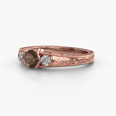 Nous avons donné le nom Tasia à cette bague de fiançailles. Cette bague de fiançailles filigranes forgée en or 14 Carat est sertie d’un quartz fumé de 5 mm. Votre petite amie a-t-elle un faible pour le vintage ? Vous pouvez donc être sûr que cette bague de fiançailles forgée en or rose conviendra à son style ! Un nouveau modèle basé sur des motifs vintage. Un peu de rêve, un beau design, surtout si vous l’ajustez encore plus à votre goût. De magnifiques quartz fumé ont été sertis sur cette bague de fiançailles trois pierres vintage. Comme vous pouvez le constater, vous pouvez choisir vous-même une pierre précieuse qui convient à votre petite amie. Chaque pierre précieuse est soigneusement sélectionnée par nos commerçants du monde entier. Notre orfèvre ne veut travailler que les plus belles pierres précieuses sur votre bijou. Après tout, c'est la couronne de son travail ! Chaque bijou est faite avec passion et amour par l'un de nos maîtres orfèvres.En combinant les dernières techniques modernes, associées à une fabrication ancienne, nous sommes en mesure de fabriquer nos bagues de fiançailles dans notre propre studio. Chaque bijou est fabriqué sur commande. Ceci est avantageux car nous sommes en mesure de vous proposer un prix que vous ne trouverez nulle part ailleurs.Notre équipe ajoute quotidiennement de nouveaux modèles à notre collection en ligne. Nos designers et orfèvres travaillent ensemble pour créer le meilleur design. Nous nous efforçons d'offrir une collection diversifiée de bijoux. Peut-être avez-vous déjà en tête un bijou en particulier ? Un bijou que vous avez trouvé quelque part. Veuillez nous contacter pour une consultation gratuite. Nous vous ferons une offre, basée sur un rapport qualité / prix juste, qui vous déconcertera.Pour vous faciliter la tâche, vous pouvez facilement nous retourner tout bijou commandé dans les 30 jours suivant la livraison.