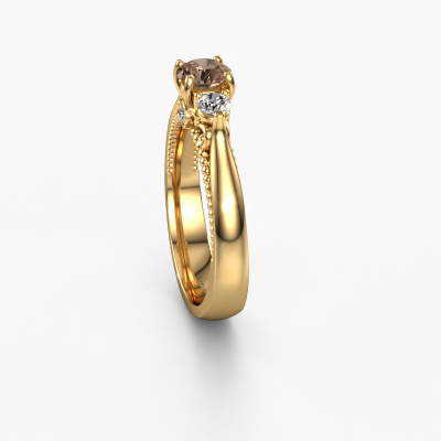 Cette bague de fiançailles porte le nom Tiffani. Cette bague de fiançailles ajour est forgée en or 14 Carat et est sertie d’un diamant brun de 0.74 crt. Cette bague de fiançailles trois pierres et forgée en or jaune unique est un pur travail d’art ! Tous les petits détails ont été fabriqués avec beaucoup de patience et de passion par notre orfèvre. Ce métier nécessite un œil expert et une main habile pour assembler cette bague de fiançailles avec la plus grande précision. Et ce travail est précisément ce qui enthousiasme nos orfèvres ! Les plus beaux diamants bruns sont sertis de manière large, de telle sorte qu'ils puissent rendre un effet encore meilleurs. Cela donne donc une allure supplémentaire à la bague de fiançailles. La bague de fiançailles est unique en raison de sa pierre précieuse naturelle, que nous avons spécialement sélectionnée pour cette bague. De plus, vous pouvez choisir vous-même la composition du métal précieux de votre bague. Vous aurez donc créé une bague de fiançailles unique pour la femmes la plus unique de votre vie ! Ce bijou est fabriquée spécialement pour vous par nos maîtres orfèvres dans notre propre atelier.Saviez-vous que nous offrons la garantie du meilleur prix pour votre bague de fiançailles? Cela est possible car tous nos bijoux sont fabriqués à la main dans notre propre atelier. Nous n'avons pas de frais de stocks qui sont coûteux, et nous fabriquons votre bague uniquement une fois que vous l'avez commandée. Grâce au fait que nous ayons toute la production du bijou en main, nous pouvons vous informer sur toutes les caractéristiques de cette bague de fiançailles. C’est précisément parce que l’achat d’une bague en ligne est une expérience excitante que nous comprenons qu’il est plus confortable pour vous de connaître toutes les caractéristiques de votre bague.Avez-vous déjà des bague de fiançailles spécifiques en tête ? Une bague de fiançailles que vous avez vu quelque part. N'hésitez pas à nous faire part de vos souhaits et nous transformerons votre design en des bague de fiançailles uniques. Vous êtes en mesure de suivre l'évolution de la conception de vos bague de fiançailles car nous utilisons des dessins en 3D. Cela vous donnera un aperçu réaliste de votre design. Nous vous enverrons volontiers une offre sans engagement basée sur un rapport qualité / prix juste. Elle va vous étonner.Pour vous faciliter la tâche, vous pouvez facilement nous retourner tout bijou commandé dans les 30 jours suivant la livraison.
