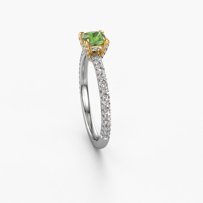 La bague de fiançailles mentionnée ci-dessus a été nommée Saskia 2 cus. Ce type de bague de fiançailles est appelé une bague de fiançailles solitaire pavé car elle ne comporte qu’une seule pierre centrale et les tiges de la bague de fiançailles sont également pleins. La bague de fiançailles est faite dans une combinaison d'or 14 Carat et d’or jaune et a un vert tourmaline coussin d’une de 4.5 mm, et des diamants synthétiques sont sertis sur les épaules de l’anneau. Chaque bijou est faite spécialement pour vous, avec une attention particulière portée aux détails et au design. Cette bague de fiançailles solitaire pavé forgée en or blanc contemporains a un beau vert tourmaline coussin comme pierre centrale, avec plus de vert tourmaline sertis dans la bague pour accentuer encore plus la présence de la pierre centrale. Le sertissage à griffes autour du vert tourmaline étant ouvert, le vert tourmaline capte la lumière de tous les côtés et brille de manière optimale. Ci-dessus, vous pouvez voir comment notre orfèvre travaille la bague de fiançailles avec une extrême précision dans les moindres détails, de telle sorte que le vert tourmaline élevé puisse attirer tous les regards. Quelle belle bague de fiançailles à offrir lors de votre demande en mariage à l'amour de votre vie, à votre centre rayonnant ! Vous avez peut-être remarqué que nos prix sont en moyenne inférieurs de 30% à ceux d'un autre bijoutier. Et ce alors que la qualité de nos bijoux est même plus élevée dans la plupart des cas ! En effet, nos orfèvres fabriquent votre bague de fiançailles directement dans notre propre atelier. Cela signifie que nous n'avons pas à inclure des frais de stocks coûteux et que nous pouvons travailler n'importe quel détail directement sur votre bague de fiançailles.Notre équipe de designers talentueux et passionnés ajoute chaque jour de nouveaux modèles bague de fiançailles à notre collection en ligne. Notre objectif est de pouvoir vous offrir une grande variété de bijoux. N'hésitez pas à demander un devis si vous avez des souhaits spécifiques pour votre bague de fiançailles. Nous garantissons de vous faire une offre que vous ne pourrez pas refuser.Pour vous faciliter la tâche, vous pouvez facilement nous retourner tout bijou commandé dans les 30 jours suivant la livraison.