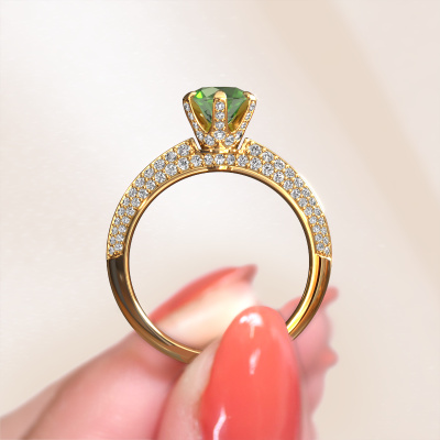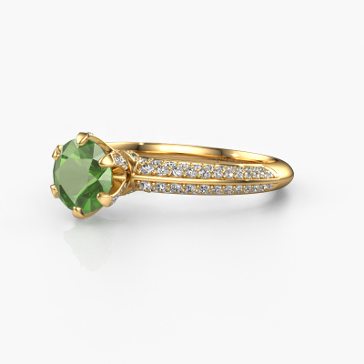 La bague de fiançailles mentionnée ci-dessus a été nommée Abby. Ce type de bague de fiançailles est appelé une bague de fiançailles solitaire pavé car elle ne comporte qu’une seule pierre centrale et les tiges de la bague de fiançailles sont également pleins. La bague de fiançailles est faite dans une combinaison d'or 14 Carat et d’or jaune et a un vert tourmaline ronds d’une de 6.5 mm, et des diamants sont sertis sur les épaules de l’anneau. Chaque bijou est fabriquées spécialement pour vous par nos maîtres orfèvres dans notre propre atelier. Cette bague de fiançailles solitaire pavé forgée en or jaune exclusives a un beau vert tourmaline ronds comme pierre centrale, avec plus de vert tourmaline sertis dans la bague pour accentuer encore plus la présence de la pierre centrale. Le sertissage à griffes autour du vert tourmaline étant ouvert, le vert tourmaline capte la lumière de tous les côtés et brille de manière optimale. Ci-dessus, vous pouvez voir comment notre orfèvre travaille la bague de fiançailles avec une extrême précision dans les moindres détails, de telle sorte que le vert tourmaline élevé puisse attirer tous les regards. Quelle belle bague de fiançailles à offrir lors de votre demande en mariage à l'amour de votre vie, à votre centre rayonnant ! Vous avez peut-être remarqué que nos prix sont en moyenne inférieurs de 30% à ceux d'un autre bijoutier. Et ce alors que la qualité de nos bijoux est même plus élevée dans la plupart des cas ! En effet, nos orfèvres fabriquent votre bague de fiançailles directement dans notre propre atelier. Cela signifie que nous n'avons pas à inclure des frais de stocks coûteux et que nous pouvons travailler n'importe quel détail directement sur votre bague de fiançailles.Notre équipe ajoute quotidiennement de nouveaux modèles à notre collection en ligne. Nos designers et orfèvres travaillent ensemble pour créer le meilleur design. Nous nous efforçons d'offrir une collection diversifiée de bijoux. Peut-être avez-vous déjà en tête un bijou en particulier ? Un bijou que vous avez trouvé quelque part. Veuillez nous contacter pour une consultation gratuite. Nous vous ferons une offre, basée sur un rapport qualité / prix juste, qui vous déconcertera.Pour vous faciliter la tâche, vous pouvez facilement nous retourner tout bijou commandé dans les 30 jours suivant la livraison.