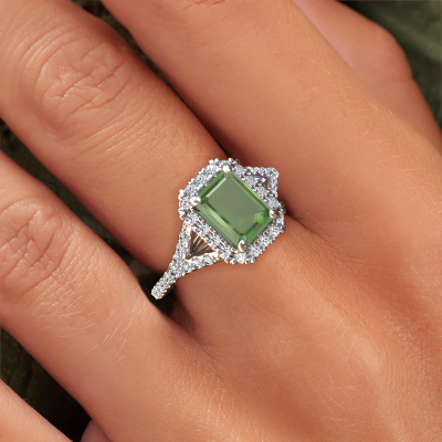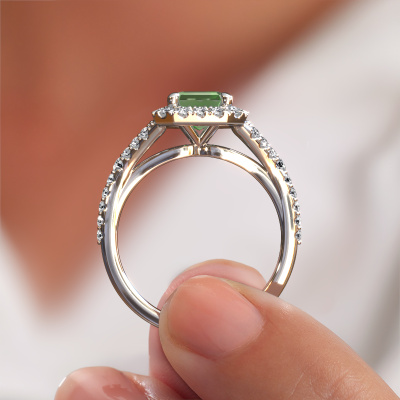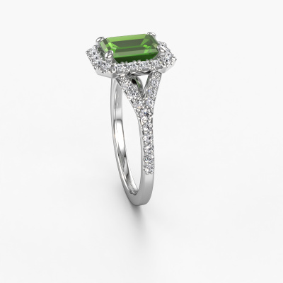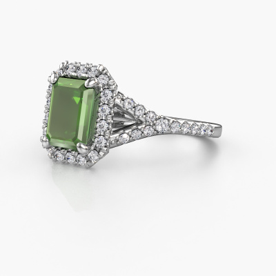 La bague de fiançailles mentionnée ci-dessus a été nommée Kimber EME. Ce type de bague de fiançailles est appelé une bague de fiançailles solitaire pavé car elle ne comporte qu’une seule pierre centrale et les tiges de la bague de fiançailles sont également pleins. La bague de fiançailles est faite dans une combinaison d'or et d’platine et a un vert tourmaline taille émeraude d’une de 8x6 mm, et des diamants synthétiques sont sertis sur les épaules de l’anneau. Chaque bijou est fabriquée par une équipe d'orfèvres et de designers motivés. Cela permettra à cette pièce unique d'attirer tous les regards. Cette bague de fiançailles solitaire pavé forgée en platine exclusives a un beau vert tourmaline taille émeraude comme pierre centrale, avec plus de vert tourmaline sertis dans la bague pour accentuer encore plus la présence de la pierre centrale. Le sertissage à griffes autour du vert tourmaline étant ouvert, le vert tourmaline capte la lumière de tous les côtés et brille de manière optimale. Ci-dessus, vous pouvez voir comment notre orfèvre travaille la bague de fiançailles avec une extrême précision dans les moindres détails, de telle sorte que le vert tourmaline élevé puisse attirer tous les regards. Quelle belle bague de fiançailles à offrir lors de votre demande en mariage à l'amour de votre vie, à votre centre rayonnant ! En combinant les dernières techniques modernes, associées à une fabrication ancienne, nous sommes en mesure de fabriquer nos bagues de fiançailles dans notre propre studio. Chaque bijou est fabriqué sur commande. Ceci est avantageux car nous sommes en mesure de vous proposer un prix que vous ne trouverez nulle part ailleurs.Notre équipe ajoute quotidiennement de nouveaux modèles à notre collection en ligne. Nos designers et orfèvres travaillent ensemble pour créer le meilleur design. Nous nous efforçons d'offrir une collection diversifiée de bijoux. Peut-être avez-vous déjà en tête un bijou en particulier ? Un bijou que vous avez trouvé quelque part. Veuillez nous contacter pour une consultation gratuite. Nous vous ferons une offre, basée sur un rapport qualité / prix juste, qui vous déconcertera.Pour vous faciliter la tâche, vous pouvez facilement nous retourner tout bijou commandé dans les 30 jours suivant la livraison.