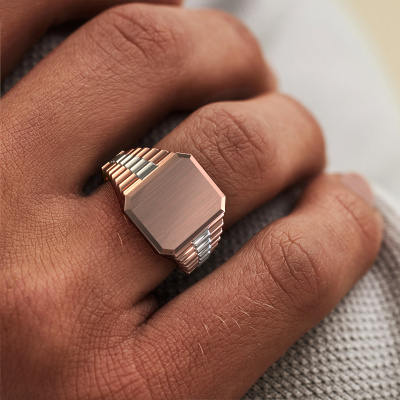 Tout le monde connaît le design de cette marque horlogère bien connue. Avec ses maillons de deux couleurs d’or, cette 2 couleurs bague Erik 2 forgée en or rose 14 Carat, convient à l’homme modernes et accompli. Un homme qui veut faire une déclaration avec une chevalière frappante. Montrez qui vous êtes ! Votre chevalière personnelle élégants Erik 2 que vous vous créez est fabriquée avec amour et passion par nos orfèvres. Préféreriez-vous une option autre que la chevalière en or rose présentée ici ? Vous avez alors diverses options possibles via le configurateur. Si vous n'êtes pas complètement sûr(e), nous serons ravis de vous conseiller ! Nos designers talentueux ajoutent quotidiennement de nouveaux modèles à notre collection en ligne. Ensemble, ils créent une collection variée des plus beaux bijoux. Si vous préférez créer des bagues selon votre propre conception, n'hésitez pas à demander un devis. Nous vous ferons une offre incroyable, basée sur la qualité et le prix.En utilisant nos techniques modernes, nous sommes en mesure de concevoir et de personnaliser les bijoux de la plus haute qualité avec le plus grand soin pour vous. Nos bagues ont toujours un prix inférieur de 30% à celles des autres bijoutiers. Nous fabriquons des bagues à la commande afin de ne pas avoir à garder un stock important. Si vous avez un certain budget, nous serons ravis de vous conseiller tout en le respectant.Pour vous faciliter la tâche, vous pouvez facilement nous retourner tout bijou commandé dans les 30 jours suivant la livraison.