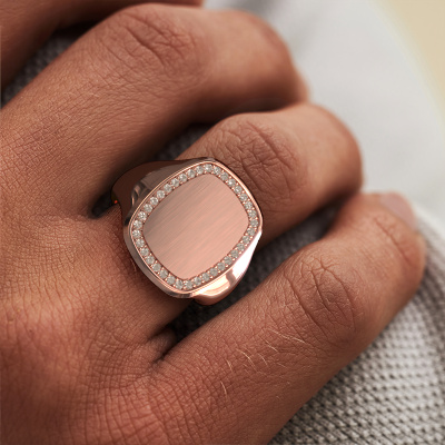 Avec cette plate bague pour homme Floris Cushion 4, vous pouvez faire passer un message personnel, et avoir la bonne bague est une déclaration personnelle puissante. Ici, la bague pour homme élégant Floris Cushion 4 présentée est forgée en or 14 Carat. Si la couleur ne vous plait pas, vous pouvez l’ajuster en choisissant le métal précieux que vous préférez. Enfin, vous voulez une bague pour homme qui corresponde à votre style. Une bague qui vous appartient. Et le message que vous voulez faire passer : c'est moi. Que pensez-vous de cette chevalière modernes en or rose ? Vous pouvez créer cette chevalière Floris Cushion 4 via notre configurateur. Votre chevalière personnelle élégants est par la suite fabriquée à la main par nos orfèvres. Le choix du métal précieux et des pierres précieuses peut être entièrement personnalisé. Avez-vous certaines idées pour votre chevalière, mais vous ne pouvez pas trouver nos options qui leur correspondent ? Alors faites-nous le savoir. Nous fabriquons votre chevalière personnelle modernes entièrement selon vos souhaits.
