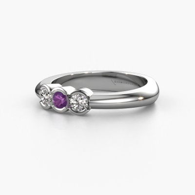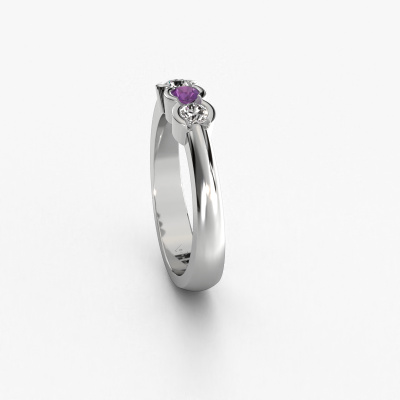 Cette bague style 3 pierres porte le nom de Lotte 3. Ce type de bague s'appelle «Mémoire», car elle est créée avec un profil droit. Cela permet de porter la bague à côté d'autres bagues. Cette bague est en or blanc 14 Carat et contient un améthyste associé à une diamant de 3 mm serties sur l'anneau. Comme vous pouvez le constater, avec cette belle mémoire pour femmes en or blanc, de améthystes sont sertis les uns à côté des autres sur la bague. Le sens de l'mémoire est littéralement de 'travailler ensemble'. Et c’est exactement ce que font ces pierres précieuses : ensemble, elles créent un effet spécial supplémentaire sur l'anneau avec un anneau modernes ! Une belle symbolique pour un anneau, non ? Tous les améthystes soigneusement sélectionnés sont placés à la main par notre maître orfèvre. Un travail très précis, qui tire le meilleur parti de notre combinaison unique d'artisanat pur et des techniques d'orfèvre les plus modernes. Toutes les pierres précieuses doivent être serties exactement de la même manière pour diffuser parfaitement la lumière. Par conséquent, l'orfèvre gardera cette bague sous la lumière pour voir si les améthystes sont placés correctement. Cela demande une main habile et beaucoup de patience, mais le résultat est un véritable chef-d'œuvre. Et c'est ce que nous recherchons ! En combinant les dernières techniques modernes, associées à une fabrication ancienne, nous sommes en mesure de fabriquer nos bagues dans notre propre studio. Chaque bijou est fabriqué sur commande. Ceci est avantageux car nous sommes en mesure de vous proposer un prix que vous ne trouverez nulle part ailleurs. Notre équipe de designers talentueux et passionnés ajoute chaque jour de nouveaux modèles bagues à notre collection en ligne. Notre objectif est de pouvoir vous offrir une grande variété de bijoux. N'hésitez pas à demander un devis si vous avez des souhaits spécifiques pour votre bague. Nous garantissons de vous faire une offre que vous ne pourrez pas refuser. Pour vous faciliter la tâche, vous pouvez facilement nous retourner tout bijou commandé dans les 30 jours suivant la livraison.'