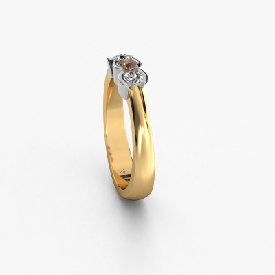 Cette bague style 3 pierres porte le nom de Lotte 3. Ce type de bague s'appelle «Mémoire», car elle est créée avec un profil droit. Cela permet de porter la bague à côté d'autres bagues. Cette bague est en or jaune 14 Carat et contient un diamant brun associé à une diamant de 0.10 crt serties sur l'anneau. Comme vous pouvez le constater, avec cette belle mémoire pour femmes en or jaune, de diamants bruns sont sertis les uns à côté des autres sur la bague. Le sens de l'mémoire est littéralement de 'travailler ensemble'. Et c’est exactement ce que font ces pierres précieuses : ensemble, elles créent un effet spécial supplémentaire sur l'anneau avec un anneau modernes ! Une belle symbolique pour un anneau, non ? Tous les diamants bruns soigneusement sélectionnés sont placés à la main par notre maître orfèvre. Un travail très précis, qui tire le meilleur parti de notre combinaison unique d'artisanat pur et des techniques d'orfèvre les plus modernes. Toutes les pierres précieuses doivent être serties exactement de la même manière pour diffuser parfaitement la lumière. Par conséquent, l'orfèvre gardera cette bague sous la lumière pour voir si les diamants bruns sont placés correctement. Cela demande une main habile et beaucoup de patience, mais le résultat est un véritable chef-d'œuvre. Et c'est ce que nous recherchons ! En combinant les dernières techniques modernes, associées à une fabrication ancienne, nous sommes en mesure de fabriquer nos bagues dans notre propre studio. Chaque bijou est fabriqué sur commande. Ceci est avantageux car nous sommes en mesure de vous proposer un prix que vous ne trouverez nulle part ailleurs. Notre équipe de designers talentueux et passionnés ajoute chaque jour de nouveaux modèles bagues à notre collection en ligne. Notre objectif est de pouvoir vous offrir une grande variété de bijoux. N'hésitez pas à demander un devis si vous avez des souhaits spécifiques pour votre bague. Nous garantissons de vous faire une offre que vous ne pourrez pas refuser. Pour vous faciliter la tâche, vous pouvez facilement nous retourner tout bijou commandé dans les 30 jours suivant la livraison.'