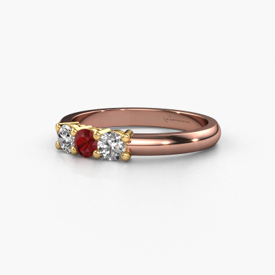 Cette bague style 3 pierres porte le nom de Michelle 3. Ce type de bague s'appelle «Mémoire», car elle est créée avec un profil droit. Cela permet de porter la bague à côté d'autres bagues. Cette bague est en or rose 14 Carat et contient un rubis associé à une diamant synthétique de 3.7 mm serties sur l'anneau. Comme vous pouvez le constater, avec cette belle mémoire pour femmes en or rose, de rubis sont sertis les uns à côté des autres sur la bague. Le sens de l'mémoire est littéralement de 'travailler ensemble'. Et c’est exactement ce que font ces pierres précieuses : ensemble, elles créent un effet spécial supplémentaire sur l'anneau avec un anneau classiques ! Une belle symbolique pour un anneau, non ? Tous les rubis soigneusement sélectionnés sont placés à la main par notre maître orfèvre. Un travail très précis, qui tire le meilleur parti de notre combinaison unique d'artisanat pur et des techniques d'orfèvre les plus modernes. Toutes les pierres précieuses doivent être serties exactement de la même manière pour diffuser parfaitement la lumière. Par conséquent, l'orfèvre gardera cette bague sous la lumière pour voir si les rubis sont placés correctement. Cela demande une main habile et beaucoup de patience, mais le résultat est un véritable chef-d'œuvre. Et c'est ce que nous recherchons ! Devez-vous respecter un certain budget ? N'hésitez pas à nous contacter, nous serons heureux de vous conseiller sur toutes les possibilités. Dans tous les cas, nous offrons toutes les bagues à un prix que vous ne trouverez nulle part ailleurs, car nous ne fabriquerons la bague uniquement lorsque vous la commanderez. Cela nous permet de vous donner la garantie du meilleur prix.