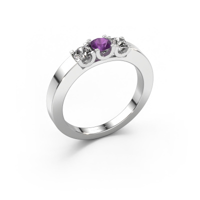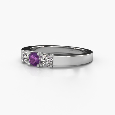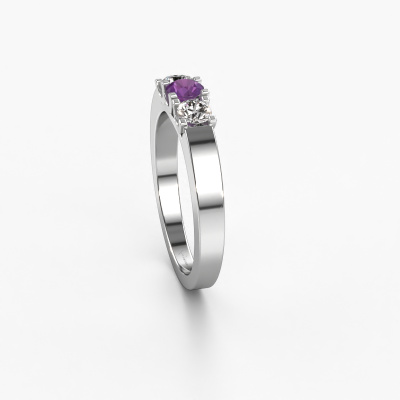Cette bague style 3 pierres porte le nom de Selina 1. Ce type de bague s'appelle «Mémoire», car elle est créée avec un profil droit. Cela permet de porter la bague à côté d'autres bagues. Cette bague est en platine et contient un améthyste associé à une diamant de 3.7 mm serties sur l'anneau. Comme vous pouvez le constater, avec cette belle mémoire pour femmes en platine, de améthystes sont sertis les uns à côté des autres sur la bague. Le sens de l'mémoire est littéralement de 'travailler ensemble'. Et c’est exactement ce que font ces pierres précieuses : ensemble, elles créent un effet spécial supplémentaire sur l'anneau avec un anneau modernes ! Une belle symbolique pour un anneau, non ? Tous les améthystes soigneusement sélectionnés sont placés à la main par notre maître orfèvre. Un travail très précis, qui tire le meilleur parti de notre combinaison unique d'artisanat pur et des techniques d'orfèvre les plus modernes. Toutes les pierres précieuses doivent être serties exactement de la même manière pour diffuser parfaitement la lumière. Par conséquent, l'orfèvre gardera cette bague sous la lumière pour voir si les améthystes sont placés correctement. Cela demande une main habile et beaucoup de patience, mais le résultat est un véritable chef-d'œuvre. Et c'est ce que nous recherchons ! En utilisant nos techniques modernes, nous sommes en mesure de concevoir et de personnaliser les bijoux de la plus haute qualité avec le plus grand soin pour vous. Nos bagues ont toujours un prix inférieur de 30% à celles des autres bijoutiers. Nous fabriquons des bagues à la commande afin de ne pas avoir à garder un stock important. Si vous avez un certain budget, nous serons ravis de vous conseiller tout en le respectant. De nouveaux modèles de bijoux sont ajoutés à notre collection en ligne quotidiennement. Notre équipe de designers passionnés s'efforce de créer des designs extraordinaires et variés. Avez-vous vu une bague qui vous plait ? N'hésitez pas à nous contacter. Grâce à un bon rapport qualité / prix, nous vous ferons une offre que vous ne pourrez pas refuser ! Pour vous faciliter la tâche, vous pouvez facilement nous retourner tout bijou commandé dans les 30 jours suivant la livraison.'