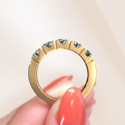 Cette bague style 5 pierres porte le nom de Dana 5. Ce type de bague s'appelle «Mémoire», car elle est créée avec un profil droit. Cela permet de porter la bague à côté d'autres bagues. Cette bague est en or jaune 14 Carat et contient un diamant associé à une diamant de 0.25 crt serties sur l'anneau. Comme vous pouvez le constater, avec cette belle mémoire pour femmes en or jaune, de diamants sont sertis les uns à côté des autres sur la bague. Le sens de l'mémoire est littéralement de 'travailler ensemble'. Et c’est exactement ce que font ces pierres précieuses : ensemble, elles créent un effet spécial supplémentaire sur l'anneau avec un anneau modernes ! Une belle symbolique pour un anneau, non ? Tous les diamants soigneusement sélectionnés sont placés à la main par notre maître orfèvre. Un travail très précis, qui tire le meilleur parti de notre combinaison unique d'artisanat pur et des techniques d'orfèvre les plus modernes. Toutes les pierres précieuses doivent être serties exactement de la même manière pour diffuser parfaitement la lumière. Par conséquent, l'orfèvre gardera cette bague sous la lumière pour voir si les diamants sont placés correctement. Cela demande une main habile et beaucoup de patience, mais le résultat est un véritable chef-d'œuvre. Et c'est ce que nous recherchons ! Puisque nous concevons et livrons nos propres bijoux, nous sommes en mesure de vous proposer une bague à un prix que vous ne pourrez pas trouver ailleurs. Une alliance est fabriquée sur commande, ce qui permet d'éviter les excédents de matériel et nous permet de vous proposer une superbe offre de prix. Nous comprenons qu'acheter votre bague en ligne soit un risque, mais nous vous assistons volontiers dans le processus de conception, en tenant compte de votre budget. De nouveaux modèles de bijoux sont ajoutés à notre collection en ligne quotidiennement. Notre équipe de designers passionnés s'efforce de créer des designs extraordinaires et variés. Avez-vous vu une bague qui vous plait ? N'hésitez pas à nous contacter. Grâce à un bon rapport qualité / prix, nous vous ferons une offre que vous ne pourrez pas refuser ! Pour vous faciliter la tâche, vous pouvez facilement nous retourner tout bijou commandé dans les 30 jours suivant la livraison.'