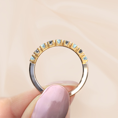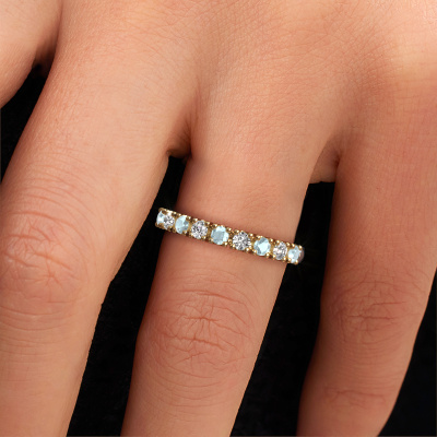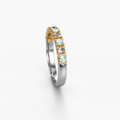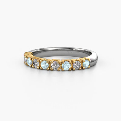 Cette bague style 9 pierres porte le nom de Rianne 9. Ce type de bague s'appelle «Mémoire», car elle est créée avec un profil droit. Cela permet de porter la bague à côté d'autres bagues. Cette bague est en or blanc 14 Carat et contient un aigue-marine associé à une diamant de 2.4 mm serties sur l'anneau. Comme vous pouvez le constater, avec cette belle mémoire pour femmes en or blanc, de aigues-marines sont sertis les uns à côté des autres sur la bague. Le sens de l'mémoire est littéralement de 'travailler ensemble'. Et c’est exactement ce que font ces pierres précieuses : ensemble, elles créent un effet spécial supplémentaire sur l'anneau avec un anneau classiques ! Une belle symbolique pour un anneau, non ? Tous les aigues-marines soigneusement sélectionnés sont placés à la main par notre maître orfèvre. Un travail très précis, qui tire le meilleur parti de notre combinaison unique d'artisanat pur et des techniques d'orfèvre les plus modernes. Toutes les pierres précieuses doivent être serties exactement de la même manière pour diffuser parfaitement la lumière. Par conséquent, l'orfèvre gardera cette bague sous la lumière pour voir si les aigues-marines sont placés correctement. Cela demande une main habile et beaucoup de patience, mais le résultat est un véritable chef-d'œuvre. Et c'est ce que nous recherchons ! Devez-vous respecter un certain budget ? N'hésitez pas à nous contacter, nous serons heureux de vous conseiller sur toutes les possibilités. Dans tous les cas, nous offrons toutes les bagues à un prix que vous ne trouverez nulle part ailleurs, car nous ne fabriquerons la bague uniquement lorsque vous la commanderez. Cela nous permet de vous donner la garantie du meilleur prix.