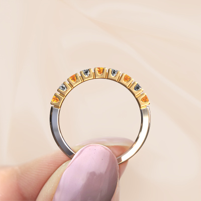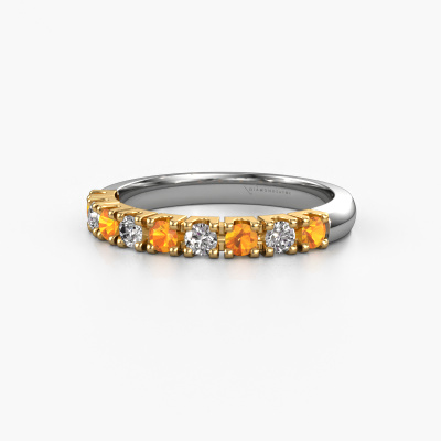 Cette bague style 9 pierres porte le nom de Rianne 9. Ce type de bague s'appelle «Mémoire», car elle est créée avec un profil droit. Cela permet de porter la bague à côté d'autres bagues. Cette bague est en or blanc 14 Carat et contient un citrine associé à une diamant de 2.4 mm serties sur l'anneau. Comme vous pouvez le constater, avec cette belle mémoire pour femmes en or blanc, de citrines sont sertis les uns à côté des autres sur la bague. Le sens de l'mémoire est littéralement de 'travailler ensemble'. Et c’est exactement ce que font ces pierres précieuses : ensemble, elles créent un effet spécial supplémentaire sur l'anneau avec un anneau classiques ! Une belle symbolique pour un anneau, non ? Tous les citrines soigneusement sélectionnés sont placés à la main par notre maître orfèvre. Un travail très précis, qui tire le meilleur parti de notre combinaison unique d'artisanat pur et des techniques d'orfèvre les plus modernes. Toutes les pierres précieuses doivent être serties exactement de la même manière pour diffuser parfaitement la lumière. Par conséquent, l'orfèvre gardera cette bague sous la lumière pour voir si les citrines sont placés correctement. Cela demande une main habile et beaucoup de patience, mais le résultat est un véritable chef-d'œuvre. Et c'est ce que nous recherchons ! Devez-vous respecter un certain budget ? N'hésitez pas à nous contacter, nous serons heureux de vous conseiller sur toutes les possibilités. Dans tous les cas, nous offrons toutes les bagues à un prix que vous ne trouverez nulle part ailleurs, car nous ne fabriquerons la bague uniquement lorsque vous la commanderez. Cela nous permet de vous donner la garantie du meilleur prix.