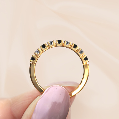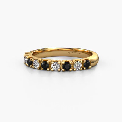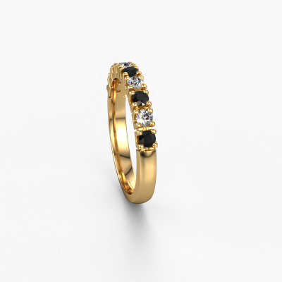 Cette bague style 9 pierres porte le nom de Rianne 9. Ce type de bague s'appelle «Mémoire», car elle est créée avec un profil droit. Cela permet de porter la bague à côté d'autres bagues. Cette bague est en or jaune 14 Carat et contient un diamant noir associé à une diamant de 0.066 crt serties sur l'anneau. Comme vous pouvez le constater, avec cette belle mémoire pour femmes en or jaune, de diamants noirs sont sertis les uns à côté des autres sur la bague. Le sens de l'mémoire est littéralement de 'travailler ensemble'. Et c’est exactement ce que font ces pierres précieuses : ensemble, elles créent un effet spécial supplémentaire sur l'anneau avec un anneau classiques ! Une belle symbolique pour un anneau, non ? Tous les diamants noirs soigneusement sélectionnés sont placés à la main par notre maître orfèvre. Un travail très précis, qui tire le meilleur parti de notre combinaison unique d'artisanat pur et des techniques d'orfèvre les plus modernes. Toutes les pierres précieuses doivent être serties exactement de la même manière pour diffuser parfaitement la lumière. Par conséquent, l'orfèvre gardera cette bague sous la lumière pour voir si les diamants noirs sont placés correctement. Cela demande une main habile et beaucoup de patience, mais le résultat est un véritable chef-d'œuvre. Et c'est ce que nous recherchons ! Devez-vous respecter un certain budget ? N'hésitez pas à nous contacter, nous serons heureux de vous conseiller sur toutes les possibilités. Dans tous les cas, nous offrons toutes les bagues à un prix que vous ne trouverez nulle part ailleurs, car nous ne fabriquerons la bague uniquement lorsque vous la commanderez. Cela nous permet de vous donner la garantie du meilleur prix.
