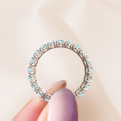 Cette bague porte le nom Vivienne 2.9 et le type de bague s'appelle une bague éternité. Par conséquent, toutes les pierres précieuses sont serties autour de l'anneau de la bague. Cette bague forgée en or blanc 14 Carat a tout autour des petits aigues-marines de 2.9 mm. Cette bague éternité pour femmes forgée en or blanc est une jolie bague qui rendra votre demande en mariage très spéciale. Les aigues-marines brillants sont tous d'identique et sont sertis autour de la bague. Tous les aigues-marines sont soigneusement sélectionnés, précisément parce qu'ils doivent être aussi identiques que possible pour créer le meilleur résultat possible sur cette bague. Ce sont des produits de la nature, de sorte qu'il existe encore des différences minimes entre chaque pierre. Mais comme tous nos aigues-marines sont placés à la main avec beaucoup de précision par notre orfèvre, l'effet éternité peut être renforcé. Cela demande beaucoup de patience et une main habile, mais fabriquer la bague parfaite pour femmes est une passion qui anime nos orfèvres. Le résultat est une bague magnifique dans laquelle la rangée de aigues-marines semble continuer sans fin. Le symbole de votre amour infini pour elle ! Magnifique n'est-ce pas ? En utilisant nos techniques modernes, nous sommes en mesure de concevoir et de personnaliser les bijoux de la plus haute qualité avec le plus grand soin pour vous. Nos bagues ont toujours un prix inférieur de 30% à celles des autres bijoutiers. Nous fabriquons des bagues à la commande afin de ne pas avoir à garder un stock important. Si vous avez un certain budget, nous serons ravis de vous conseiller tout en le respectant.De nouveaux modèles de bijoux sont ajoutés à notre collection en ligne quotidiennement. Notre équipe de designers passionnés s'efforce de créer des designs extraordinaires et variés. Avez-vous vu une bague qui vous plait ? N'hésitez pas à nous contacter. Grâce à un bon rapport qualité / prix, nous vous ferons une offre que vous ne pourrez pas refuser !Pour vous faciliter la tâche, vous pouvez facilement nous retourner tout bijou commandé dans les 30 jours suivant la livraison.