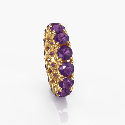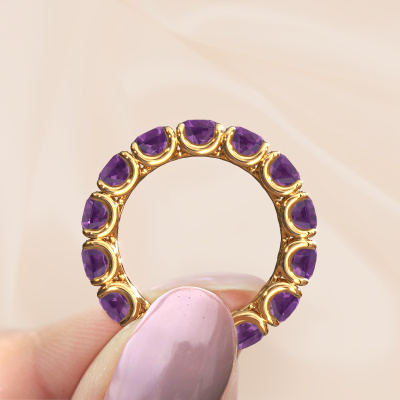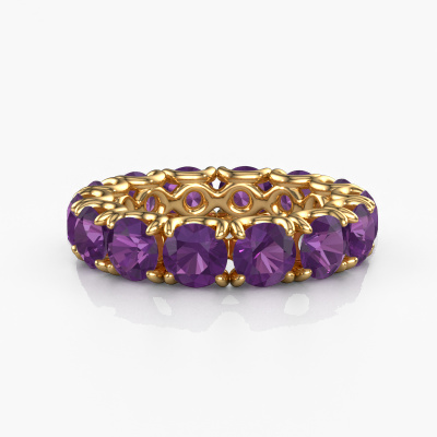 Cette bague porte le nom Estee 4.7 et le type de bague s'appelle une bague éternité. Par conséquent, toutes les pierres précieuses sont serties autour de l'anneau de la bague. Cette bague forgée en or jaune 14 Carat a tout autour des petits améthystes de 4.7 mm. Cette bague éternité pour femmes forgée en or jaune est une jolie bague qui rendra votre demande en mariage très spéciale. Les améthystes brillants sont tous d'identique et sont sertis autour de la bague. Tous les améthystes sont soigneusement sélectionnés, précisément parce qu'ils doivent être aussi identiques que possible pour créer le meilleur résultat possible sur cette bague. Ce sont des produits de la nature, de sorte qu'il existe encore des différences minimes entre chaque pierre. Mais comme tous nos améthystes sont placés à la main avec beaucoup de précision par notre orfèvre, l'effet éternité peut être renforcé. Cela demande beaucoup de patience et une main habile, mais fabriquer la bague parfaite pour femmes est une passion qui anime nos orfèvres. Le résultat est une bague magnifique dans laquelle la rangée de améthystes semble continuer sans fin. Le symbole de votre amour infini pour elle ! Magnifique n'est-ce pas ? En utilisant nos techniques modernes, nous sommes en mesure de concevoir et de personnaliser les bijoux de la plus haute qualité avec le plus grand soin pour vous. Nos bagues ont toujours un prix inférieur de 30% à celles des autres bijoutiers. Nous fabriquons des bagues à la commande afin de ne pas avoir à garder un stock important. Si vous avez un certain budget, nous serons ravis de vous conseiller tout en le respectant.