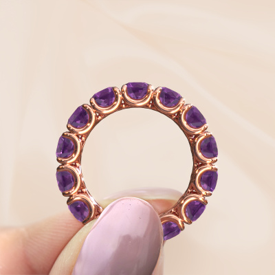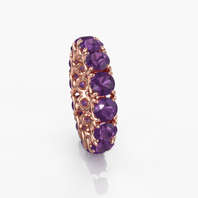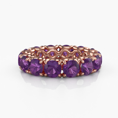 Cette bague porte le nom Estee 4.7 et le type de bague s'appelle une bague éternité. Par conséquent, toutes les pierres précieuses sont serties autour de l'anneau de la bague. Cette bague forgée en or rose 14 Carat a tout autour des petits améthystes de 4.7 mm. Cette bague éternité pour femmes forgée en or rose est une jolie bague qui rendra votre demande en mariage très spéciale. Les améthystes brillants sont tous d'identique et sont sertis autour de la bague. Tous les améthystes sont soigneusement sélectionnés, précisément parce qu'ils doivent être aussi identiques que possible pour créer le meilleur résultat possible sur cette bague. Ce sont des produits de la nature, de sorte qu'il existe encore des différences minimes entre chaque pierre. Mais comme tous nos améthystes sont placés à la main avec beaucoup de précision par notre orfèvre, l'effet éternité peut être renforcé. Cela demande beaucoup de patience et une main habile, mais fabriquer la bague parfaite pour femmes est une passion qui anime nos orfèvres. Le résultat est une bague magnifique dans laquelle la rangée de améthystes semble continuer sans fin. Le symbole de votre amour infini pour elle ! Magnifique n'est-ce pas ? En utilisant nos techniques modernes, nous sommes en mesure de concevoir et de personnaliser les bijoux de la plus haute qualité avec le plus grand soin pour vous. Nos bagues ont toujours un prix inférieur de 30% à celles des autres bijoutiers. Nous fabriquons des bagues à la commande afin de ne pas avoir à garder un stock important. Si vous avez un certain budget, nous serons ravis de vous conseiller tout en le respectant.