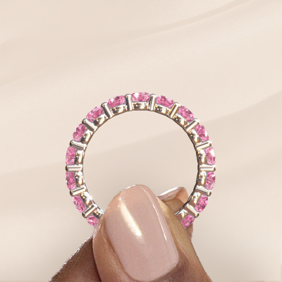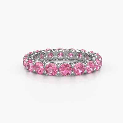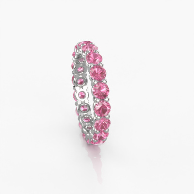 Cette bague porte le nom Heddy rnd 3.4 et le type de bague s'appelle une bague éternité. Par conséquent, toutes les pierres précieuses sont serties autour de l'anneau de la bague. Cette bague forgée en or blanc 14 Carat a tout autour des petits saphirs roses de 3.4 mm. Les saphirs roses brillants sont tous d'identique et sont sertis dans l'anneau autour de la bague. Tous les saphirs roses sont soigneusement sélectionnés, précisément parce qu'ils doivent être aussi identiques que possible pour créer le meilleur résultat possible sur cette bague. Notre orfèvre place tous les saphirs roses très précisément à la main, ce qui permet de renforcer l'effet éternité de la bague. La passion est ce qui anime nos orfèvres : créer la bague parfaite. Voici la beauté de notre métier ! Le résultat est une belle bague forgée en or blanc modernes dans laquelle la rangée de saphirs roses semble continuer sans fin. Le symbole parfait pour votre amour infini pour elle ! Voici quelque chose de particulier ! En combinant les dernières techniques modernes, associées à une fabrication ancienne, nous sommes en mesure de fabriquer nos bagues dans notre propre studio. Chaque bijou est fabriqué sur commande. Ceci est avantageux car nous sommes en mesure de vous proposer un prix que vous ne trouverez nulle part ailleurs.Nos designers talentueux ajoutent quotidiennement de nouveaux modèles à notre collection en ligne. Ensemble, ils créent une collection variée des plus beaux bijoux. Si vous préférez créer des bagues selon votre propre conception, n'hésitez pas à demander un devis. Nous vous ferons une offre incroyable, basée sur la qualité et le prix.Pour vous faciliter la tâche, vous pouvez facilement nous retourner tout bijou commandé dans les 30 jours suivant la livraison.