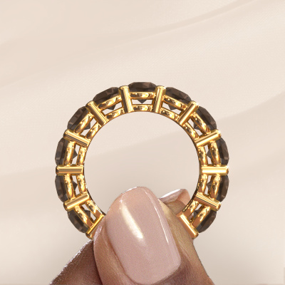 Cette bague superposable porte le nom Michelle full 5.0 et le type de bague s'appelle une bague éternité. Par conséquent, toutes les pierres précieuses sont serties autour de l'anneau de la bague. Cette bague superposable forgée en or jaune 14 Carat a tout autour des petits quartz fumé de 5 mm. Les quartz fumé brillants sont tous d'identique et sont sertis dans l'anneau autour de la bague superposable. Tous les quartz fumé sont soigneusement sélectionnés, précisément parce qu'ils doivent être aussi identiques que possible pour créer le meilleur résultat possible sur cette bague. Notre orfèvre place tous les quartz fumé très précisément à la main, ce qui permet de renforcer l'effet éternité de la bague. La passion est ce qui anime nos orfèvres : créer la bague parfaite. Voici la beauté de notre métier ! Le résultat est une belle bague forgée en or jaune exclusives dans laquelle la rangée de quartz fumé semble continuer sans fin. Le symbole parfait pour votre amour infini pour elle ! Voici quelque chose de particulier ! En combinant les dernières techniques modernes, associées à une fabrication ancienne, nous sommes en mesure de fabriquer nos bagues dans notre propre studio. Chaque bijou est fabriqué sur commande. Ceci est avantageux car nous sommes en mesure de vous proposer un prix que vous ne trouverez nulle part ailleurs.De nouveaux modèles de bijoux sont ajoutés à notre collection en ligne quotidiennement. Notre équipe de designers passionnés s'efforce de créer des designs extraordinaires et variés. Avez-vous vu une bague qui vous plait ? N'hésitez pas à nous contacter. Grâce à un bon rapport qualité / prix, nous vous ferons une offre que vous ne pourrez pas refuser !Pour vous faciliter la tâche, vous pouvez facilement nous retourner tout bijou commandé dans les 30 jours suivant la livraison.