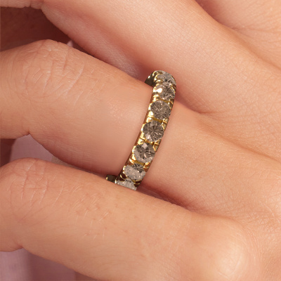 Cette bague superposable porte le nom Jackie 3.4 et le type de bague s'appelle une bague éternité. Par conséquent, toutes les pierres précieuses sont serties autour de l'anneau de la bague. Cette bague superposable forgée en or jaune 14 Carat a tout autour des petits diamants bruns de 2.700 crt. Cette bague éternité pour femmes forgée en or jaune est une jolie bague superposable qui rendra votre demande en mariage très spéciale. Les diamants bruns brillants sont tous d'identique et sont sertis autour de la bague superposable. Tous les diamants bruns sont soigneusement sélectionnés, précisément parce qu'ils doivent être aussi identiques que possible pour créer le meilleur résultat possible sur cette bague. Ce sont des produits de la nature, de sorte qu'il existe encore des différences minimes entre chaque pierre. Mais comme tous nos diamants bruns sont placés à la main avec beaucoup de précision par notre orfèvre, l'effet éternité peut être renforcé. Cela demande beaucoup de patience et une main habile, mais fabriquer la bague parfaite pour femmes est une passion qui anime nos orfèvres. Le résultat est une bague magnifique dans laquelle la rangée de diamants bruns semble continuer sans fin. Le symbole de votre amour infini pour elle ! Magnifique n'est-ce pas ? En combinant les dernières techniques modernes, associées à une fabrication ancienne, nous sommes en mesure de fabriquer nos bagues dans notre propre studio. Chaque bijou est fabriqué sur commande. Ceci est avantageux car nous sommes en mesure de vous proposer un prix que vous ne trouverez nulle part ailleurs.Nos designers talentueux ajoutent quotidiennement de nouveaux modèles à notre collection en ligne. Ensemble, ils créent une collection variée des plus beaux bijoux. Si vous préférez créer des bagues selon votre propre conception, n'hésitez pas à demander un devis. Nous vous ferons une offre incroyable, basée sur la qualité et le prix.Pour vous faciliter la tâche, vous pouvez facilement nous retourner tout bijou commandé dans les 30 jours suivant la livraison.