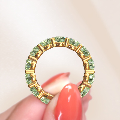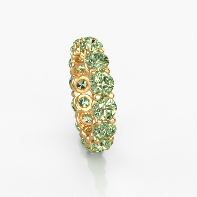Cette bague porte le nom Heddy rnd 4.7 et le type de bague s'appelle une bague éternité. Par conséquent, toutes les pierres précieuses sont serties autour de l'anneau de la bague. Cette bague forgée en or jaune 14 Carat a tout autour des petits diamants synthétiques vert de 4.7 mm. Cette bague éternité pour femmes forgée en or jaune est une jolie bague qui rendra votre demande en mariage très spéciale. Les diamants synthétiques vert brillants sont tous d'identique et sont sertis autour de la bague. Tous les diamants synthétiques vert sont soigneusement sélectionnés, précisément parce qu'ils doivent être aussi identiques que possible pour créer le meilleur résultat possible sur cette bague. Ce sont des produits de la nature, de sorte qu'il existe encore des différences minimes entre chaque pierre. Mais comme tous nos diamants synthétiques vert sont placés à la main avec beaucoup de précision par notre orfèvre, l'effet éternité peut être renforcé. Cela demande beaucoup de patience et une main habile, mais fabriquer la bague parfaite pour femmes est une passion qui anime nos orfèvres. Le résultat est une bague magnifique dans laquelle la rangée de diamants synthétiques vert semble continuer sans fin. Le symbole de votre amour infini pour elle ! Magnifique n'est-ce pas ?