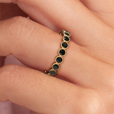Cette bague porte le nom Mariam 0.05 et le type de bague s'appelle une bague éternité. Par conséquent, toutes les pierres précieuses sont serties autour de l'anneau de la bague. Cette bague forgée en or jaune 14 Carat a tout autour des petits diamants noirs de 1.32 crt. Les diamants noirs brillants sont tous d'identique et sont sertis dans l'anneau autour de la bague. Tous les diamants noirs sont soigneusement sélectionnés, précisément parce qu'ils doivent être aussi identiques que possible pour créer le meilleur résultat possible sur cette bague. Notre orfèvre place tous les diamants noirs très précisément à la main, ce qui permet de renforcer l'effet éternité de la bague. La passion est ce qui anime nos orfèvres : créer la bague parfaite. Voici la beauté de notre métier ! Le résultat est une belle bague forgée en or jaune modernes dans laquelle la rangée de diamants noirs semble continuer sans fin. Le symbole parfait pour votre amour infini pour elle ! Voici quelque chose de particulier ! En combinant les dernières techniques modernes, associées à une fabrication ancienne, nous sommes en mesure de fabriquer nos bagues dans notre propre studio. Chaque bijou est fabriqué sur commande. Ceci est avantageux car nous sommes en mesure de vous proposer un prix que vous ne trouverez nulle part ailleurs.