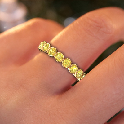 Cette bague porte le nom Mariam 0.07 et le type de bague s'appelle une bague éternité. Par conséquent, toutes les pierres précieuses sont serties autour de l'anneau de la bague. Cette bague forgée en or jaune 14 Carat a tout autour des petits saphirs jaunes de 2.7 mm. Les saphirs jaunes brillants sont tous d'identique et sont sertis dans l'anneau autour de la bague. Tous les saphirs jaunes sont soigneusement sélectionnés, précisément parce qu'ils doivent être aussi identiques que possible pour créer le meilleur résultat possible sur cette bague. Notre orfèvre place tous les saphirs jaunes très précisément à la main, ce qui permet de renforcer l'effet éternité de la bague. La passion est ce qui anime nos orfèvres : créer la bague parfaite. Voici la beauté de notre métier ! Le résultat est une belle bague forgée en or jaune tendances dans laquelle la rangée de saphirs jaunes semble continuer sans fin. Le symbole parfait pour votre amour infini pour elle ! Voici quelque chose de particulier ! En combinant les dernières techniques modernes, associées à une fabrication ancienne, nous sommes en mesure de fabriquer nos bagues dans notre propre studio. Chaque bijou est fabriqué sur commande. Ceci est avantageux car nous sommes en mesure de vous proposer un prix que vous ne trouverez nulle part ailleurs.Nos designers talentueux ajoutent quotidiennement de nouveaux modèles à notre collection en ligne. Ensemble, ils créent une collection variée des plus beaux bijoux. Si vous préférez créer des bagues selon votre propre conception, n'hésitez pas à demander un devis. Nous vous ferons une offre incroyable, basée sur la qualité et le prix.Pour vous faciliter la tâche, vous pouvez facilement nous retourner tout bijou commandé dans les 30 jours suivant la livraison.