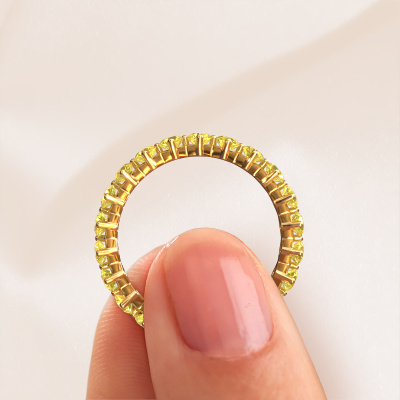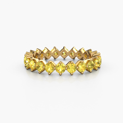 Cette bague superposable porte le nom Janie 2.7mm et le type de bague s'appelle une bague éternité. Par conséquent, toutes les pierres précieuses sont serties autour de l'anneau de la bague. Cette bague superposable forgée en or jaune 14 Carat a tout autour des petits saphirs jaunes de 2.7 mm. Les saphirs jaunes brillants sont tous d'identique et sont sertis dans l'anneau autour de la bague superposable. Tous les saphirs jaunes sont soigneusement sélectionnés, précisément parce qu'ils doivent être aussi identiques que possible pour créer le meilleur résultat possible sur cette bague. Notre orfèvre place tous les saphirs jaunes très précisément à la main, ce qui permet de renforcer l'effet éternité de la bague. La passion est ce qui anime nos orfèvres : créer la bague parfaite. Voici la beauté de notre métier ! Le résultat est une belle bague forgée en or jaune tendances dans laquelle la rangée de saphirs jaunes semble continuer sans fin. Le symbole parfait pour votre amour infini pour elle ! Voici quelque chose de particulier ! En combinant les dernières techniques modernes, associées à une fabrication ancienne, nous sommes en mesure de fabriquer nos bagues dans notre propre studio. Chaque bijou est fabriqué sur commande. Ceci est avantageux car nous sommes en mesure de vous proposer un prix que vous ne trouverez nulle part ailleurs.
