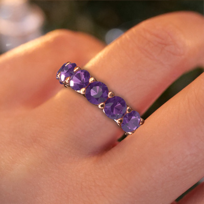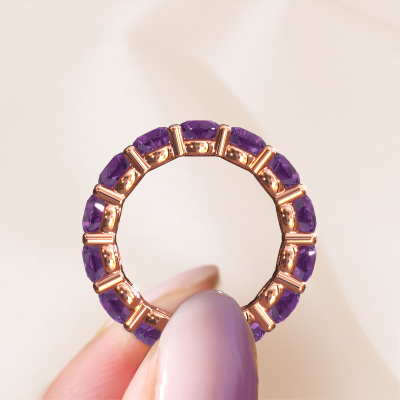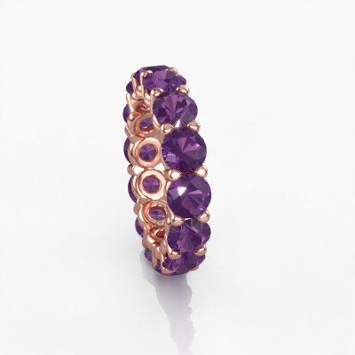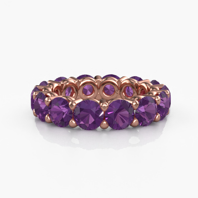 Cette bague porte le nom Heddy rnd 5.0 et le type de bague s'appelle une bague éternité. Par conséquent, toutes les pierres précieuses sont serties autour de l'anneau de la bague. Cette bague forgée en or rose 14 Carat a tout autour des petits améthystes de 5 mm. Les améthystes brillants sont tous d'identique et sont sertis dans l'anneau autour de la bague. Tous les améthystes sont soigneusement sélectionnés, précisément parce qu'ils doivent être aussi identiques que possible pour créer le meilleur résultat possible sur cette bague. Notre orfèvre place tous les améthystes très précisément à la main, ce qui permet de renforcer l'effet éternité de la bague. La passion est ce qui anime nos orfèvres : créer la bague parfaite. Voici la beauté de notre métier ! Le résultat est une belle bague forgée en or rose exclusives dans laquelle la rangée de améthystes semble continuer sans fin. Le symbole parfait pour votre amour infini pour elle ! Voici quelque chose de particulier ! En combinant les dernières techniques modernes, associées à une fabrication ancienne, nous sommes en mesure de fabriquer nos bagues dans notre propre studio. Chaque bijou est fabriqué sur commande. Ceci est avantageux car nous sommes en mesure de vous proposer un prix que vous ne trouverez nulle part ailleurs.
