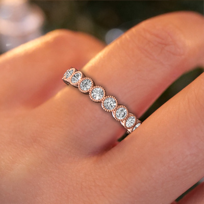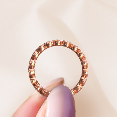 Cette bague porte le nom Mariam 0.07 et le type de bague s'appelle une bague éternité. Par conséquent, toutes les pierres précieuses sont serties autour de l'anneau de la bague. Cette bague forgée en or rose 14 Carat a tout autour des petits diamants synthétiques de 1.44 crt. Les diamants synthétiques brillants sont tous d'identique et sont sertis dans l'anneau autour de la bague. Tous les diamants synthétiques sont soigneusement sélectionnés, précisément parce qu'ils doivent être aussi identiques que possible pour créer le meilleur résultat possible sur cette bague. Notre orfèvre place tous les diamants synthétiques très précisément à la main, ce qui permet de renforcer l'effet éternité de la bague. La passion est ce qui anime nos orfèvres : créer la bague parfaite. Voici la beauté de notre métier ! Le résultat est une belle bague forgée en or rose tendances dans laquelle la rangée de diamants synthétiques semble continuer sans fin. Le symbole parfait pour votre amour infini pour elle ! Voici quelque chose de particulier ! En combinant les dernières techniques modernes, associées à une fabrication ancienne, nous sommes en mesure de fabriquer nos bagues dans notre propre studio. Chaque bijou est fabriqué sur commande. Ceci est avantageux car nous sommes en mesure de vous proposer un prix que vous ne trouverez nulle part ailleurs.Nos designers talentueux ajoutent quotidiennement de nouveaux modèles à notre collection en ligne. Ensemble, ils créent une collection variée des plus beaux bijoux. Si vous préférez créer des bagues selon votre propre conception, n'hésitez pas à demander un devis. Nous vous ferons une offre incroyable, basée sur la qualité et le prix.Pour vous faciliter la tâche, vous pouvez facilement nous retourner tout bijou commandé dans les 30 jours suivant la livraison.
