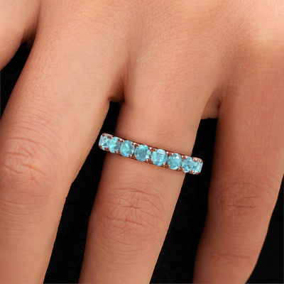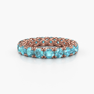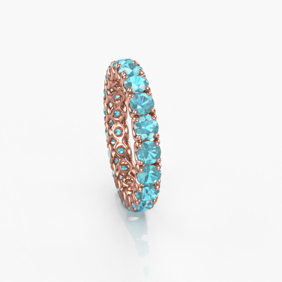 Cette bague superposable porte le nom Estee 3.4 et le type de bague s'appelle une bague éternité. Par conséquent, toutes les pierres précieuses sont serties autour de l'anneau de la bague. Cette bague superposable forgée en or rose 14 Carat a tout autour des petits topaze bleue de 3.4 mm. Les topaze bleue brillants sont tous d'identique et sont sertis dans l'anneau autour de la bague superposable. Tous les topaze bleue sont soigneusement sélectionnés, précisément parce qu'ils doivent être aussi identiques que possible pour créer le meilleur résultat possible sur cette bague. Notre orfèvre place tous les topaze bleue très précisément à la main, ce qui permet de renforcer l'effet éternité de la bague. La passion est ce qui anime nos orfèvres : créer la bague parfaite. Voici la beauté de notre métier ! Le résultat est une belle bague forgée en or rose modernes dans laquelle la rangée de topaze bleue semble continuer sans fin. Le symbole parfait pour votre amour infini pour elle ! Voici quelque chose de particulier ! En combinant les dernières techniques modernes, associées à une fabrication ancienne, nous sommes en mesure de fabriquer nos bagues dans notre propre studio. Chaque bijou est fabriqué sur commande. Ceci est avantageux car nous sommes en mesure de vous proposer un prix que vous ne trouverez nulle part ailleurs.