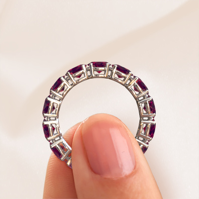 Cette bague porte le nom Vivienne OVL 5x4 et le type de bague s'appelle une bague éternité. Par conséquent, toutes les pierres précieuses sont serties autour de l'anneau de la bague. Cette bague forgée en or blanc 14 Carat a tout autour des petits rhodolites de 5x4 mm. Cette bague éternité pour femmes forgée en or blanc est une jolie bague qui rendra votre demande en mariage très spéciale. Les rhodolites brillants sont tous d'identique et sont sertis autour de la bague. Tous les rhodolites sont soigneusement sélectionnés, précisément parce qu'ils doivent être aussi identiques que possible pour créer le meilleur résultat possible sur cette bague. Ce sont des produits de la nature, de sorte qu'il existe encore des différences minimes entre chaque pierre. Mais comme tous nos rhodolites sont placés à la main avec beaucoup de précision par notre orfèvre, l'effet éternité peut être renforcé. Cela demande beaucoup de patience et une main habile, mais fabriquer la bague parfaite pour femmes est une passion qui anime nos orfèvres. Le résultat est une bague magnifique dans laquelle la rangée de rhodolites semble continuer sans fin. Le symbole de votre amour infini pour elle ! Magnifique n'est-ce pas ? En utilisant nos techniques modernes, nous sommes en mesure de concevoir et de personnaliser les bijoux de la plus haute qualité avec le plus grand soin pour vous. Nos bagues ont toujours un prix inférieur de 30% à celles des autres bijoutiers. Nous fabriquons des bagues à la commande afin de ne pas avoir à garder un stock important. Si vous avez un certain budget, nous serons ravis de vous conseiller tout en le respectant.De nouveaux modèles de bijoux sont ajoutés à notre collection en ligne quotidiennement. Notre équipe de designers passionnés s'efforce de créer des designs extraordinaires et variés. Avez-vous vu une bague qui vous plait ? N'hésitez pas à nous contacter. Grâce à un bon rapport qualité / prix, nous vous ferons une offre que vous ne pourrez pas refuser !Pour vous faciliter la tâche, vous pouvez facilement nous retourner tout bijou commandé dans les 30 jours suivant la livraison.