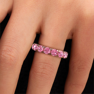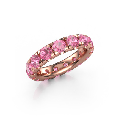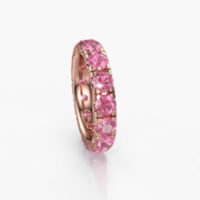 Cette bague superposable porte le nom Jackie 4.2 et le type de bague s'appelle une bague éternité. Par conséquent, toutes les pierres précieuses sont serties autour de l'anneau de la bague. Cette bague superposable forgée en or rose 14 Carat a tout autour des petits saphirs roses de 4.2 mm. Cette bague éternité pour femmes forgée en or rose est une jolie bague superposable qui rendra votre demande en mariage très spéciale. Les saphirs roses brillants sont tous d'identique et sont sertis autour de la bague superposable. Tous les saphirs roses sont soigneusement sélectionnés, précisément parce qu'ils doivent être aussi identiques que possible pour créer le meilleur résultat possible sur cette bague. Ce sont des produits de la nature, de sorte qu'il existe encore des différences minimes entre chaque pierre. Mais comme tous nos saphirs roses sont placés à la main avec beaucoup de précision par notre orfèvre, l'effet éternité peut être renforcé. Cela demande beaucoup de patience et une main habile, mais fabriquer la bague parfaite pour femmes est une passion qui anime nos orfèvres. Le résultat est une bague magnifique dans laquelle la rangée de saphirs roses semble continuer sans fin. Le symbole de votre amour infini pour elle ! Magnifique n'est-ce pas ? Nos orfèvres ne fabriqueront votre bague qu'une fois que vous l'aurez commandée. Nous ne faisons pas de stock. L'avantage de cela est que nous n'avons pas à inclure les frais de stockage dans nos prix, et nous pouvons donc vous offrir des bijoux à un prix très bas.De nouveaux modèles de bijoux sont ajoutés à notre collection en ligne quotidiennement. Notre équipe de designers passionnés s'efforce de créer des designs extraordinaires et variés. Avez-vous vu une bague qui vous plait ? N'hésitez pas à nous contacter. Grâce à un bon rapport qualité / prix, nous vous ferons une offre que vous ne pourrez pas refuser !Pour vous faciliter la tâche, vous pouvez facilement nous retourner tout bijou commandé dans les 30 jours suivant la livraison.