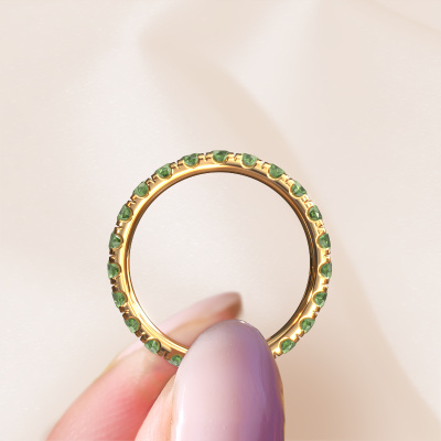 Cette bague porte le nom Jackie 2.5 et le type de bague s'appelle une bague éternité. Par conséquent, toutes les pierres précieuses sont serties autour de l'anneau de la bague. Cette bague forgée en or jaune 14 Carat a tout autour des petits vert tourmaline de 2.5 mm. Cette bague éternité pour femmes forgée en or jaune est une jolie bague qui rendra votre demande en mariage très spéciale. Les vert tourmaline brillants sont tous d'identique et sont sertis autour de la bague. Tous les vert tourmaline sont soigneusement sélectionnés, précisément parce qu'ils doivent être aussi identiques que possible pour créer le meilleur résultat possible sur cette bague. Ce sont des produits de la nature, de sorte qu'il existe encore des différences minimes entre chaque pierre. Mais comme tous nos vert tourmaline sont placés à la main avec beaucoup de précision par notre orfèvre, l'effet éternité peut être renforcé. Cela demande beaucoup de patience et une main habile, mais fabriquer la bague parfaite pour femmes est une passion qui anime nos orfèvres. Le résultat est une bague magnifique dans laquelle la rangée de vert tourmaline semble continuer sans fin. Le symbole de votre amour infini pour elle ! Magnifique n'est-ce pas ? Nos orfèvres ne fabriqueront votre bague qu'une fois que vous l'aurez commandée. Nous ne faisons pas de stock. L'avantage de cela est que nous n'avons pas à inclure les frais de stockage dans nos prix, et nous pouvons donc vous offrir des bijoux à un prix très bas.De nouveaux modèles de bijoux sont ajoutés à notre collection en ligne quotidiennement. Notre équipe de designers passionnés s'efforce de créer des designs extraordinaires et variés. Avez-vous vu une bague qui vous plait ? N'hésitez pas à nous contacter. Grâce à un bon rapport qualité / prix, nous vous ferons une offre que vous ne pourrez pas refuser !Pour vous faciliter la tâche, vous pouvez facilement nous retourner tout bijou commandé dans les 30 jours suivant la livraison.