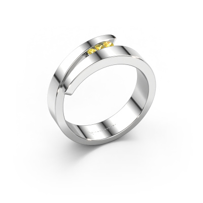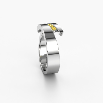 Alia est le nom que nous avons donné à cette bague. Cette bague forgée en or blanc 14 Carat est sertie d'un saphir jaune. Vous recherchez une Bague forgée en or blanc unique et avec un look modernes ? Voici donc une belle bague que vous pouvez aussi ajuster à votre goût. Parfait donc pour une femmes contemporaine et modernes ! Un magnifique saphir jaune est serti dans cette bague fantaisie. Celui-ci est sélectionné avec soin, car seules les plus belles pierres précieuses de votre bague peuvent la faire briller. Notre orfèvre fabrique votre bague dans notre propre atelier et place le saphir jaune dans l'anneau avec une précision extrême. Donc, il est travaillé et poli jusqu'à ce que le résultat soit visible : la bague parfaite ! Une fois que vous avez conçu votre bague Alia avec notre configurateur, nos orfèvres se mettent à sa fabrication pour vous. La fabrication se fait de manière traditionnelle avec passion et soin. De plus, nous travaillons avec des matériaux extraits de façon équitable. Si vous voulez changer quelque chose, vous pouvez le faire avec notre configurateur. Si vous avez des souhaits spécifiques pour votre bague Alia, mais si vous ne voyez pas une option qui leur corresponde dans le configurateur, veuillez contacter notre équipe de designers expérimentés.Puisque nous concevons et livrons nos propres bijoux, nous sommes en mesure de vous proposer une bague à un prix que vous ne pourrez pas trouver ailleurs. Une alliance est fabriquée sur commande, ce qui permet d'éviter les excédents de matériel et nous permet de vous proposer une superbe offre de prix. Nous comprenons qu'acheter votre bague en ligne soit un risque, mais nous vous assistons volontiers dans le processus de conception, en tenant compte de votre budget.Pour vous faciliter la tâche, vous pouvez facilement nous retourner tout bijou commandé dans les 30 jours suivant la livraison.Êtes-vous prête à faire vos choix personnels pour assembler la bague fantaisie Alia ? Ou avez-vous des questions ? Consultez notre foire aux questions ou contactez notre équipe d'orfèvres !