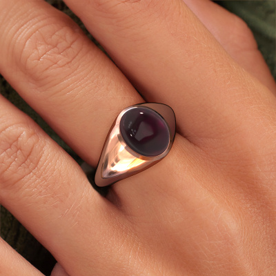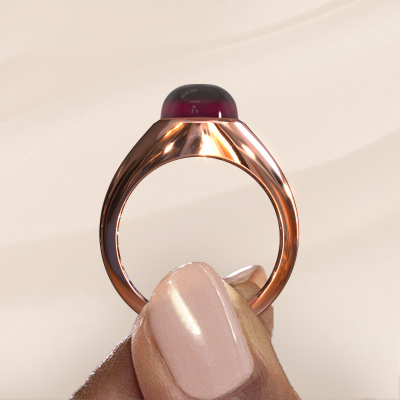 Sur la photo, vous pouvez voir la bague forgée en or rose Zaza avec un cabochon grenat. Cabochon signifie que le grenat est d'abord affûté en une forme spécifique, telle que la forme d'une goutte, d'un cœur ou une forme cabochon ovale. Puis que des couches sont coupées du haut de la pierre jusqu'à ce que la pierre ait une belle forme convexe. Un bijou avec une pierre précieuse taillée en cabochon est magnifique, attire élégamment tous les regards et correspond parfaitement à un style design et plus encore à un style vintage. Votre bague 1 pierre est finalisée dans les moindres détails par nos orfèvres jusqu'à la création de votre bague unique, dans laquelle le grenat cabochon prend tout son sens. Une bague sur mesure design et gracieuse est le cadeau parfait ! De nouveaux designs exquis sont ajoutés quotidiennement par notre équipe d'orfèvres passionnés. Et chaque design peut être personnalisé. Personnalisez simplement les métaux précieux et la couleur des pierres précieuses qui seront utilisées, par exemple. Cela rendra votre design de bague design Zaza vraiment unique ! Vous pouvez également graver votre bague. DiamondsByMe se fera un plaisir de le faire pour vous ! Nos orfèvres ne fabriqueront votre bague qu'une fois que vous l'aurez commandée. Nous ne faisons pas de stock. L'avantage de cela est que nous n'avons pas à inclure les frais de stockage dans nos prix, et nous pouvons donc vous offrir des bijoux à un prix très bas.Pour vous faciliter la tâche, vous pouvez facilement nous retourner tout bijou commandé dans les 30 jours suivant la livraison. Vous pouvez bien entendu toujours nous contacter si vous avez besoin de notre aide pour créer votre bague personnelle Zaza 1 pierre !