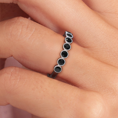 Cette bague style memoire porte le nom de Mariam half. Ce type de bague s'appelle «Mémoire», car elle est avec un profil droit. Cela permet de porter la bague avec d'autres bagues. Cette bague est en or blanc 14 Carat et contient un diamant noir de 0.066 crt. Comme vous pouvez le constater, cette belle bague mémoire pour femmes en or blanc et avec un diamant noir est placée côte à côte à la bague. Le sens de l'mémoire est littéralement de 'travailler ensemble'. Et c’est exactement ce que font ces bijoux : ensemble, ils créent un effet spécial supplémentaire sur le groupe avec un anneau fantaisie ! Une belle symbolique pour une bague, non ? Tous les diamants noirs soigneusement sélectionnés sont placés à la main par notre maître orfèvre. Un travail très précis, qui tire le meilleur parti de notre combinaison unique d'artisanat pur et des techniques d'orfèvre les plus modernes. Toutes les pierres précieuses doivent être placées exactement de la même manière pour diffuser parfaitement la lumière. Par conséquent, l'orfèvre gardera cette bague à contre-jour lors de la conception pour voir si les diamants noirs sont placés correctement. Cela demande une main habile et beaucoup de patience, mais le résultat est un véritable chef-d'œuvre. Et c'est ce que nous recherchons Devez-vous respecter un certain budget ? N'hésitez pas à nous contacter, nous serons heureux de vous conseiller sur toutes les possibilités. Dans tous les cas, nous offrons toutes les bagues à un prix que vous ne trouverez nulle part ailleurs, car nous ne fabriquerons la bague uniquement lorsque vous la commanderez. Cela nous permet de vous donner la garantie du meilleur prix.