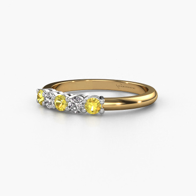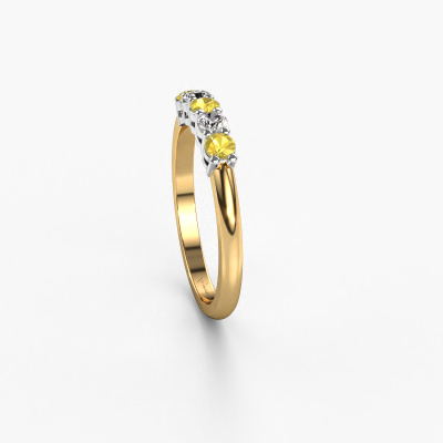 Cette bague style 5 pierres porte le nom de Michelle 5. Ce type de bague s'appelle «Mémoire», car elle est créée avec un profil droit. Cela permet de porter la bague à côté d'autres bagues. Cette bague est en or jaune 14 Carat et contient un saphir jaune associé à une diamant synthétique de 3 mm serties sur l'anneau. Comme vous pouvez le constater, avec cette belle mémoire pour femmes en or jaune, de saphirs jaunes sont sertis les uns à côté des autres sur la bague. Le sens de l'mémoire est littéralement de 'travailler ensemble'. Et c’est exactement ce que font ces pierres précieuses : ensemble, elles créent un effet spécial supplémentaire sur l'anneau avec un anneau classiques ! Une belle symbolique pour un anneau, non ? Tous les saphirs jaunes soigneusement sélectionnés sont placés à la main par notre maître orfèvre. Un travail très précis, qui tire le meilleur parti de notre combinaison unique d'artisanat pur et des techniques d'orfèvre les plus modernes. Toutes les pierres précieuses doivent être serties exactement de la même manière pour diffuser parfaitement la lumière. Par conséquent, l'orfèvre gardera cette bague sous la lumière pour voir si les saphirs jaunes sont placés correctement. Cela demande une main habile et beaucoup de patience, mais le résultat est un véritable chef-d'œuvre. Et c'est ce que nous recherchons ! [Bestp1r_long]