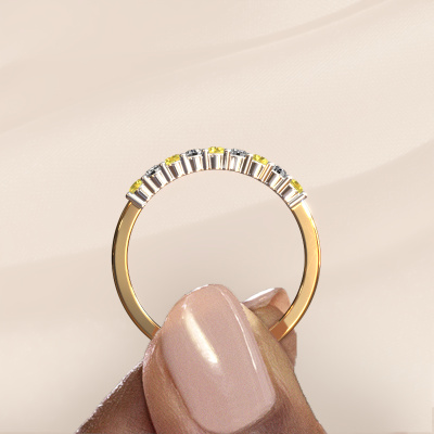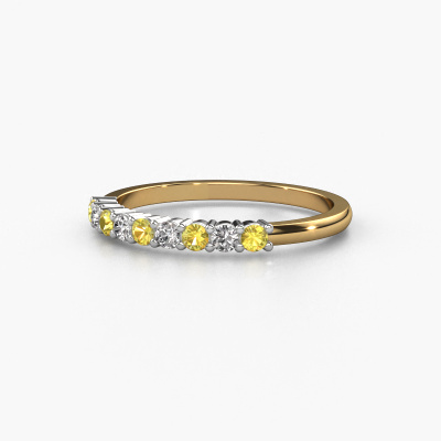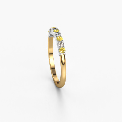 Cette bague style 9 pierres porte le nom de Yasmin 9. Ce type de bague s'appelle «Mémoire», car elle est créée avec un profil droit. Cela permet de porter la bague à côté d'autres bagues. Cette bague est en or jaune 14 Carat et contient un saphir jaune associé à une diamant de 2.4 mm serties sur l'anneau. Comme vous pouvez le constater, avec cette belle mémoire pour femmes en or jaune, de saphirs jaunes sont sertis les uns à côté des autres sur la bague. Le sens de l'mémoire est littéralement de 'travailler ensemble'. Et c’est exactement ce que font ces pierres précieuses : ensemble, elles créent un effet spécial supplémentaire sur l'anneau avec un anneau classiques ! Une belle symbolique pour un anneau, non ? Tous les saphirs jaunes soigneusement sélectionnés sont placés à la main par notre maître orfèvre. Un travail très précis, qui tire le meilleur parti de notre combinaison unique d'artisanat pur et des techniques d'orfèvre les plus modernes. Toutes les pierres précieuses doivent être serties exactement de la même manière pour diffuser parfaitement la lumière. Par conséquent, l'orfèvre gardera cette bague sous la lumière pour voir si les saphirs jaunes sont placés correctement. Cela demande une main habile et beaucoup de patience, mais le résultat est un véritable chef-d'œuvre. Et c'est ce que nous recherchons ! [Bestp1r_long] Notre équipe de designers talentueux et passionnés ajoute chaque jour de nouveaux modèles bagues à notre collection en ligne. Notre objectif est de pouvoir vous offrir une grande variété de bijoux. N'hésitez pas à demander un devis si vous avez des souhaits spécifiques pour votre bague. Nous garantissons de vous faire une offre que vous ne pourrez pas refuser. Pour vous faciliter la tâche, vous pouvez facilement nous retourner tout bijou commandé dans les 30 jours suivant la livraison.'