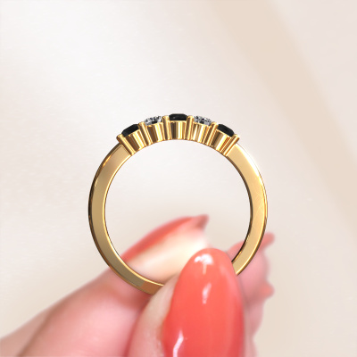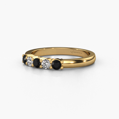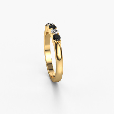 Cette bague style 5 pierres porte le nom de Yasmin 5. Ce type de bague s'appelle «Mémoire», car elle est créée avec un profil droit. Cela permet de porter la bague à côté d'autres bagues. Cette bague est en or jaune 14 Carat et contient un diamant noir associé à une diamant de 0.12 crt serties sur l'anneau. Comme vous pouvez le constater, avec cette belle mémoire pour femmes en or jaune, de diamants noirs sont sertis les uns à côté des autres sur la bague. Le sens de l'mémoire est littéralement de 'travailler ensemble'. Et c’est exactement ce que font ces pierres précieuses : ensemble, elles créent un effet spécial supplémentaire sur l'anneau avec un anneau classiques ! Une belle symbolique pour un anneau, non ? Tous les diamants noirs soigneusement sélectionnés sont placés à la main par notre maître orfèvre. Un travail très précis, qui tire le meilleur parti de notre combinaison unique d'artisanat pur et des techniques d'orfèvre les plus modernes. Toutes les pierres précieuses doivent être serties exactement de la même manière pour diffuser parfaitement la lumière. Par conséquent, l'orfèvre gardera cette bague sous la lumière pour voir si les diamants noirs sont placés correctement. Cela demande une main habile et beaucoup de patience, mais le résultat est un véritable chef-d'œuvre. Et c'est ce que nous recherchons ! [Bestp1r_long] Nos designers talentueux ajoutent quotidiennement de nouveaux modèles à notre collection en ligne. Ensemble, ils créent une collection variée des plus beaux bijoux. Si vous préférez créer des bagues selon votre propre conception, n'hésitez pas à demander un devis. Nous vous ferons une offre incroyable, basée sur la qualité et le prix. Pour vous faciliter la tâche, vous pouvez facilement nous retourner tout bijou commandé dans les 30 jours suivant la livraison.'