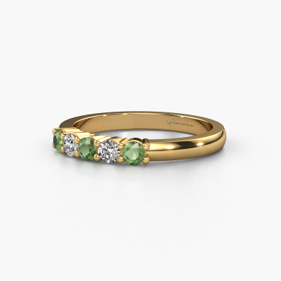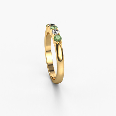Cette bague style 5 pierres porte le nom de Yasmin 5. Ce type de bague s'appelle «Mémoire», car elle est créée avec un profil droit. Cela permet de porter la bague à côté d'autres bagues. Cette bague est en or jaune 14 Carat et contient un vert tourmaline associé à une diamant de 3 mm serties sur l'anneau. Comme vous pouvez le constater, avec cette belle mémoire pour femmes en or jaune, de vert tourmaline sont sertis les uns à côté des autres sur la bague. Le sens de l'mémoire est littéralement de 'travailler ensemble'. Et c’est exactement ce que font ces pierres précieuses : ensemble, elles créent un effet spécial supplémentaire sur l'anneau avec un anneau classiques ! Une belle symbolique pour un anneau, non ? Tous les vert tourmaline soigneusement sélectionnés sont placés à la main par notre maître orfèvre. Un travail très précis, qui tire le meilleur parti de notre combinaison unique d'artisanat pur et des techniques d'orfèvre les plus modernes. Toutes les pierres précieuses doivent être serties exactement de la même manière pour diffuser parfaitement la lumière. Par conséquent, l'orfèvre gardera cette bague sous la lumière pour voir si les vert tourmaline sont placés correctement. Cela demande une main habile et beaucoup de patience, mais le résultat est un véritable chef-d'œuvre. Et c'est ce que nous recherchons ! [Bestp1r_long] Nos designers talentueux ajoutent quotidiennement de nouveaux modèles à notre collection en ligne. Ensemble, ils créent une collection variée des plus beaux bijoux. Si vous préférez créer des bagues selon votre propre conception, n'hésitez pas à demander un devis. Nous vous ferons une offre incroyable, basée sur la qualité et le prix. Pour vous faciliter la tâche, vous pouvez facilement nous retourner tout bijou commandé dans les 30 jours suivant la livraison.'