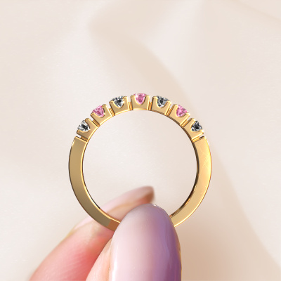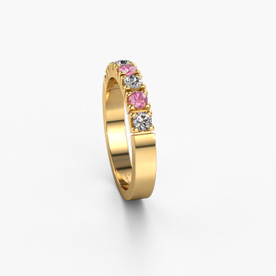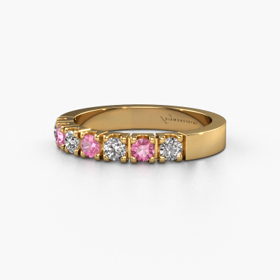 Cette bague style 7 pierres porte le nom de Dana 7. Ce type de bague s'appelle «Mémoire», car elle est créée avec un profil droit. Cela permet de porter la bague à côté d'autres bagues. Cette bague est en or jaune 14 Carat et contient un saphir rose associé à une diamant synthétique de 3 mm serties sur l'anneau. Comme vous pouvez le constater, avec cette belle mémoire pour femmes en or jaune, de saphirs roses sont sertis les uns à côté des autres sur la bague. Le sens de l'mémoire est littéralement de 'travailler ensemble'. Et c’est exactement ce que font ces pierres précieuses : ensemble, elles créent un effet spécial supplémentaire sur l'anneau avec un anneau modernes ! Une belle symbolique pour un anneau, non ? Tous les saphirs roses soigneusement sélectionnés sont placés à la main par notre maître orfèvre. Un travail très précis, qui tire le meilleur parti de notre combinaison unique d'artisanat pur et des techniques d'orfèvre les plus modernes. Toutes les pierres précieuses doivent être serties exactement de la même manière pour diffuser parfaitement la lumière. Par conséquent, l'orfèvre gardera cette bague sous la lumière pour voir si les saphirs roses sont placés correctement. Cela demande une main habile et beaucoup de patience, mais le résultat est un véritable chef-d'œuvre. Et c'est ce que nous recherchons ! [Bestp1r_long] Notre équipe de designers talentueux et passionnés ajoute chaque jour de nouveaux modèles bagues à notre collection en ligne. Notre objectif est de pouvoir vous offrir une grande variété de bijoux. N'hésitez pas à demander un devis si vous avez des souhaits spécifiques pour votre bague. Nous garantissons de vous faire une offre que vous ne pourrez pas refuser. Pour vous faciliter la tâche, vous pouvez facilement nous retourner tout bijou commandé dans les 30 jours suivant la livraison.'