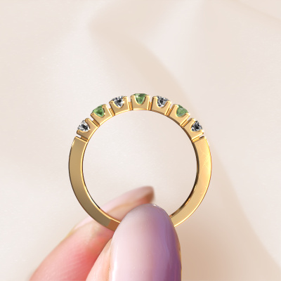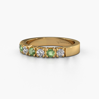 Cette bague style 7 pierres porte le nom de Dana 7. Ce type de bague s'appelle «Mémoire», car elle est créée avec un profil droit. Cela permet de porter la bague à côté d'autres bagues. Cette bague est en or jaune 14 Carat et contient un vert tourmaline associé à une diamant synthétique de 3 mm serties sur l'anneau. Comme vous pouvez le constater, avec cette belle mémoire pour femmes en or jaune, de vert tourmaline sont sertis les uns à côté des autres sur la bague. Le sens de l'mémoire est littéralement de 'travailler ensemble'. Et c’est exactement ce que font ces pierres précieuses : ensemble, elles créent un effet spécial supplémentaire sur l'anneau avec un anneau modernes ! Une belle symbolique pour un anneau, non ? Tous les vert tourmaline soigneusement sélectionnés sont placés à la main par notre maître orfèvre. Un travail très précis, qui tire le meilleur parti de notre combinaison unique d'artisanat pur et des techniques d'orfèvre les plus modernes. Toutes les pierres précieuses doivent être serties exactement de la même manière pour diffuser parfaitement la lumière. Par conséquent, l'orfèvre gardera cette bague sous la lumière pour voir si les vert tourmaline sont placés correctement. Cela demande une main habile et beaucoup de patience, mais le résultat est un véritable chef-d'œuvre. Et c'est ce que nous recherchons ! [Bestp1r_long] Notre équipe de designers talentueux et passionnés ajoute chaque jour de nouveaux modèles bagues à notre collection en ligne. Notre objectif est de pouvoir vous offrir une grande variété de bijoux. N'hésitez pas à demander un devis si vous avez des souhaits spécifiques pour votre bague. Nous garantissons de vous faire une offre que vous ne pourrez pas refuser. Pour vous faciliter la tâche, vous pouvez facilement nous retourner tout bijou commandé dans les 30 jours suivant la livraison.'