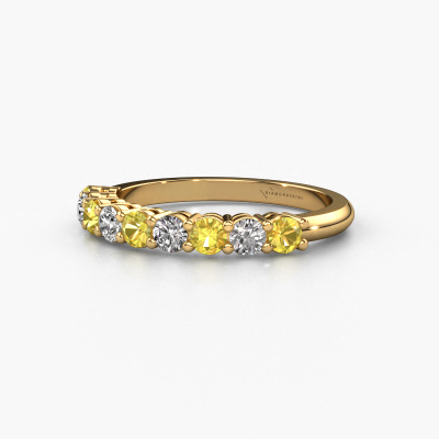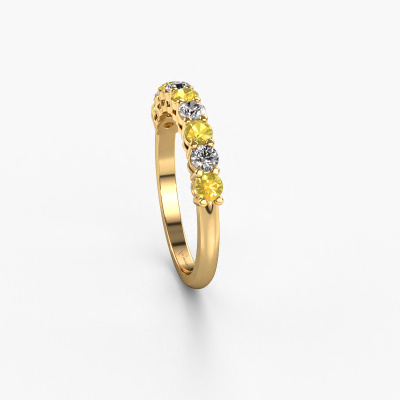 Cette bague style 9 pierres porte le nom de Michelle 9. Ce type de bague s'appelle «Mémoire», car elle est créée avec un profil droit. Cela permet de porter la bague à côté d'autres bagues. Cette bague est en or jaune 14 Carat et contient un saphir jaune associé à une diamant synthétique de 2.7 mm serties sur l'anneau. Comme vous pouvez le constater, avec cette belle mémoire pour femmes en or jaune, de saphirs jaunes sont sertis les uns à côté des autres sur la bague. Le sens de l'mémoire est littéralement de 'travailler ensemble'. Et c’est exactement ce que font ces pierres précieuses : ensemble, elles créent un effet spécial supplémentaire sur l'anneau avec un anneau classiques ! Une belle symbolique pour un anneau, non ? Tous les saphirs jaunes soigneusement sélectionnés sont placés à la main par notre maître orfèvre. Un travail très précis, qui tire le meilleur parti de notre combinaison unique d'artisanat pur et des techniques d'orfèvre les plus modernes. Toutes les pierres précieuses doivent être serties exactement de la même manière pour diffuser parfaitement la lumière. Par conséquent, l'orfèvre gardera cette bague sous la lumière pour voir si les saphirs jaunes sont placés correctement. Cela demande une main habile et beaucoup de patience, mais le résultat est un véritable chef-d'œuvre. Et c'est ce que nous recherchons ! [Bestp1r_long] Notre équipe de designers talentueux et passionnés ajoute chaque jour de nouveaux modèles bagues à notre collection en ligne. Notre objectif est de pouvoir vous offrir une grande variété de bijoux. N'hésitez pas à demander un devis si vous avez des souhaits spécifiques pour votre bague. Nous garantissons de vous faire une offre que vous ne pourrez pas refuser. Pour vous faciliter la tâche, vous pouvez facilement nous retourner tout bijou commandé dans les 30 jours suivant la livraison.'