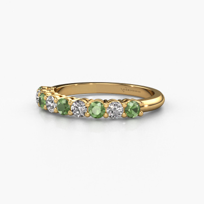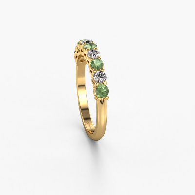 Cette bague style 9 pierres porte le nom de Michelle 9. Ce type de bague s'appelle «Mémoire», car elle est créée avec un profil droit. Cela permet de porter la bague à côté d'autres bagues. Cette bague est en or jaune 14 Carat et contient un vert tourmaline associé à une diamant synthétique de 2.7 mm serties sur l'anneau. Comme vous pouvez le constater, avec cette belle mémoire pour femmes en or jaune, de vert tourmaline sont sertis les uns à côté des autres sur la bague. Le sens de l'mémoire est littéralement de 'travailler ensemble'. Et c’est exactement ce que font ces pierres précieuses : ensemble, elles créent un effet spécial supplémentaire sur l'anneau avec un anneau classiques ! Une belle symbolique pour un anneau, non ? Tous les vert tourmaline soigneusement sélectionnés sont placés à la main par notre maître orfèvre. Un travail très précis, qui tire le meilleur parti de notre combinaison unique d'artisanat pur et des techniques d'orfèvre les plus modernes. Toutes les pierres précieuses doivent être serties exactement de la même manière pour diffuser parfaitement la lumière. Par conséquent, l'orfèvre gardera cette bague sous la lumière pour voir si les vert tourmaline sont placés correctement. Cela demande une main habile et beaucoup de patience, mais le résultat est un véritable chef-d'œuvre. Et c'est ce que nous recherchons ! [Bestp1r_long] Notre équipe de designers talentueux et passionnés ajoute chaque jour de nouveaux modèles bagues à notre collection en ligne. Notre objectif est de pouvoir vous offrir une grande variété de bijoux. N'hésitez pas à demander un devis si vous avez des souhaits spécifiques pour votre bague. Nous garantissons de vous faire une offre que vous ne pourrez pas refuser. Pour vous faciliter la tâche, vous pouvez facilement nous retourner tout bijou commandé dans les 30 jours suivant la livraison.'
